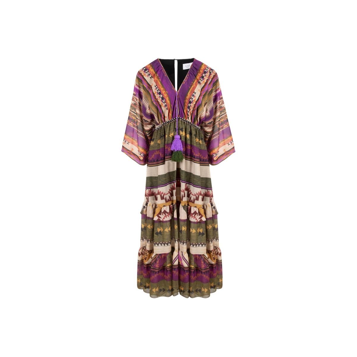 Violet - Rugs Patterned Elastic Waist Maxi Dress with Pompom Accessories Comfortable Form Maxi Dress Product ID: E24W22100. 5 Color: Multicolor Mannequin Dimensions; Model S on the mannequin. Height: 178 Chest: 80 Waist: 59 Hips: 89 Made in Turkey with 95% Polyester 5% Lurex Woven Fabric. No machine drying Wash at 30 degrees, tumble dry on low heat. Bleach cannot be used Cannot be dry cleaned Up to 150 degrees, it is recommended to iron from the reverse side