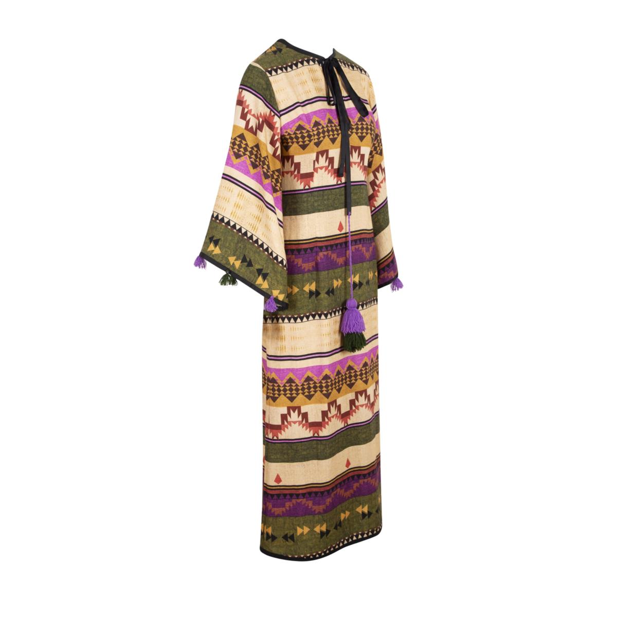 The violet rug pattern maxi dress offers a bold, eclectic vibe that can really liven up a bohemian or vintage-inspired interior. I love how its intricate pattern and rich colours can serve as a visual focal point or act as inspiration for layered, worldly decor. When styling with this dress, think of incorporating textured textiles like woven cushions or fringed throws to echo its patterns, creating a cohesive look. It works particularly well in spaces with earthy tones or muted backgrounds, allowing the vibrant colours to stand out. Practical styling tips include pairing it with simple accessories and flats for daytime, or elevating it with bold jewellery and heels for a more polished evening look, making it a versatile piece that transitions seamlessly from personal wardrobe to interior design inspiration.