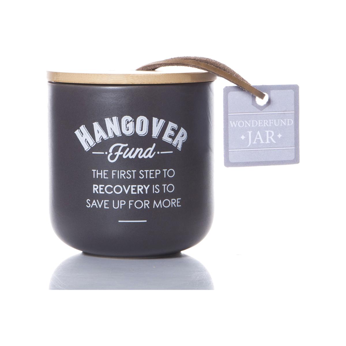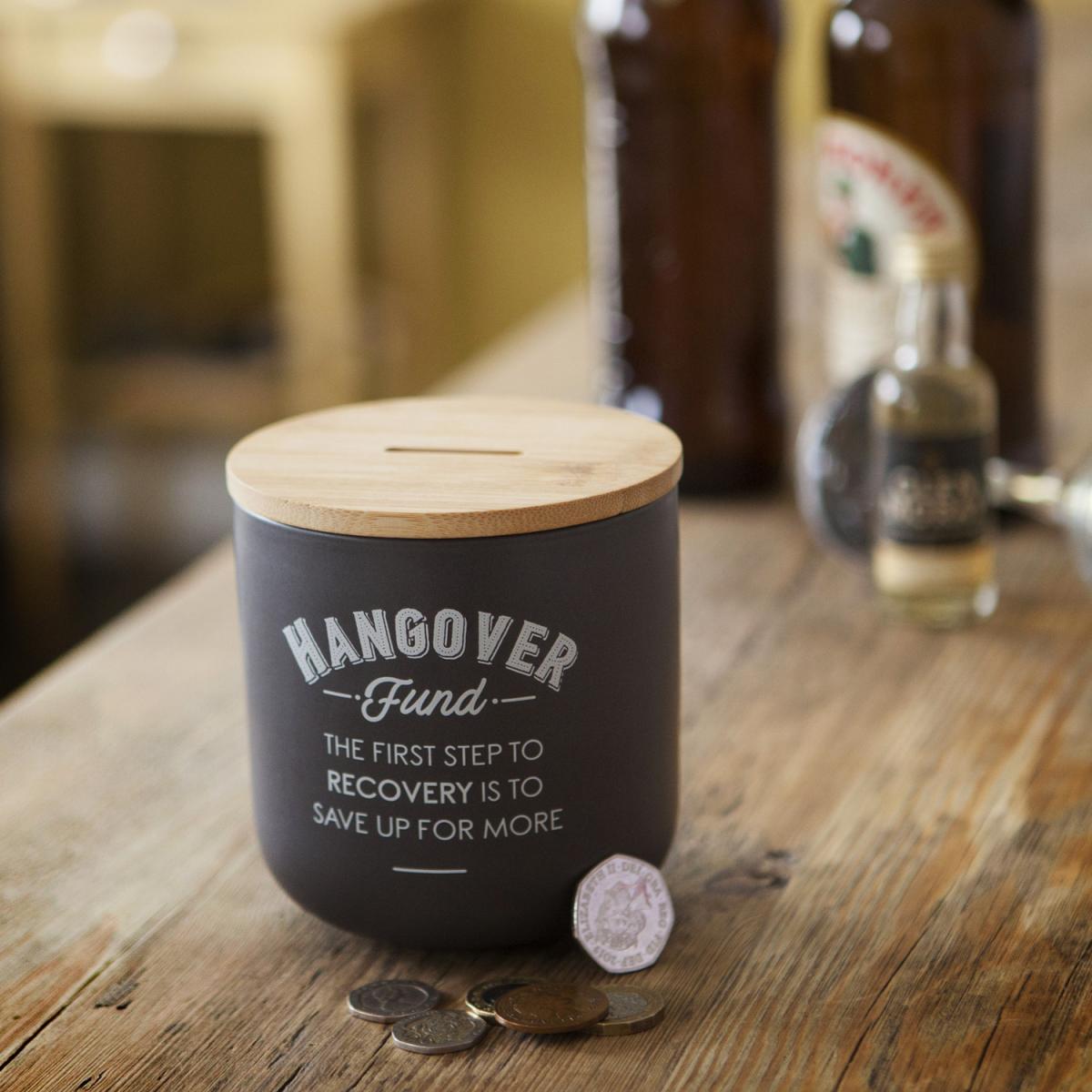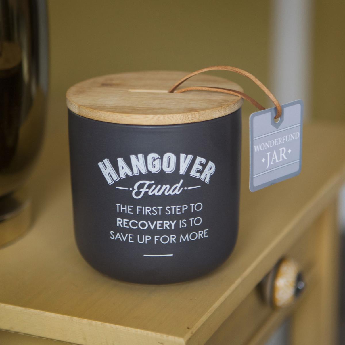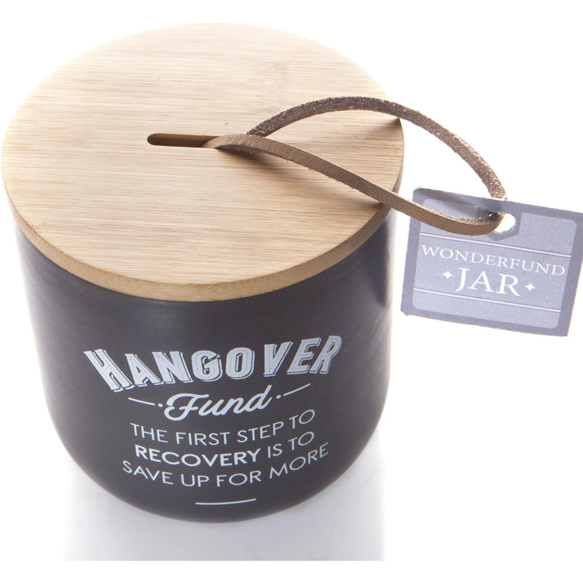 Rolled in at 5 am? Head pounding? Everyone knows the cure for a hangover is to sip more! Fund your recovery with this hilarious novelty wonderfund jar! Dark grey, with a beautiful wooden lid and stylish white text that reads "Hangover Fund - The First Step To Recovery Is To Save Up For More", this modern money saver is unique with a distinctive look from other money boxes and sits perfectly in any room of the home. Complete with an attractive gift tag attached with a high-quality leather strap, this fun and useful jar make the perfect gift for an enthusiastic boozing student on their Birthday, or at Christmas as a Secret Santa gift.