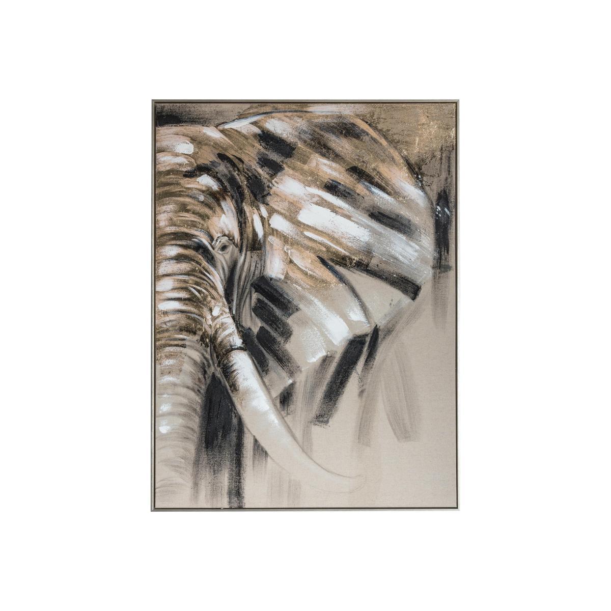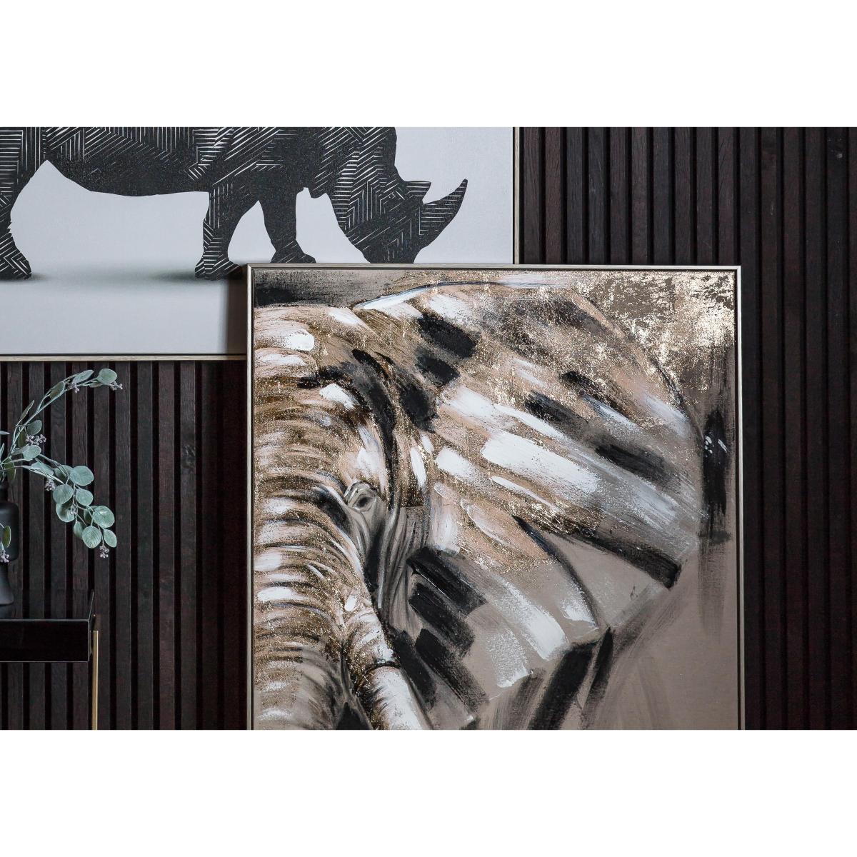 Thick, powerful brush strokes convey the strength and texture of the mighty elephant. Presented on this large canvas, the effect is powerful and immediate. Why you’ll love it. Abstract modern artwork. A subtle, moody palette of greys, white and black. Reproduced from a stunning original piece. Presented with a champagne brushed-effect frame. Made with care for Furniture Village. What you need to know. Canvas print on an MDF back board. Mounted one way only. Sawtooth fixings included. Dimensions. Height: 120cm (47.2 in). Width: 90cm (35.4 in).