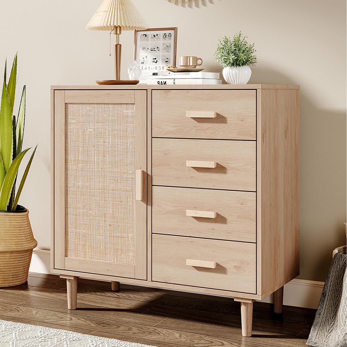This versatile side cabinet exudes a casual, cool vibe. Crafted primarily from high-quality particleboard, it ensures robust stability and long-lasting durability. Featuring four drawers and a cabinet with a door, it offers ample storage space to organize your essentials. The rattan door design adds a rustic charm, making it a standout piece. The minimalist handles provide easy access, enhancing the cabinet's functionality