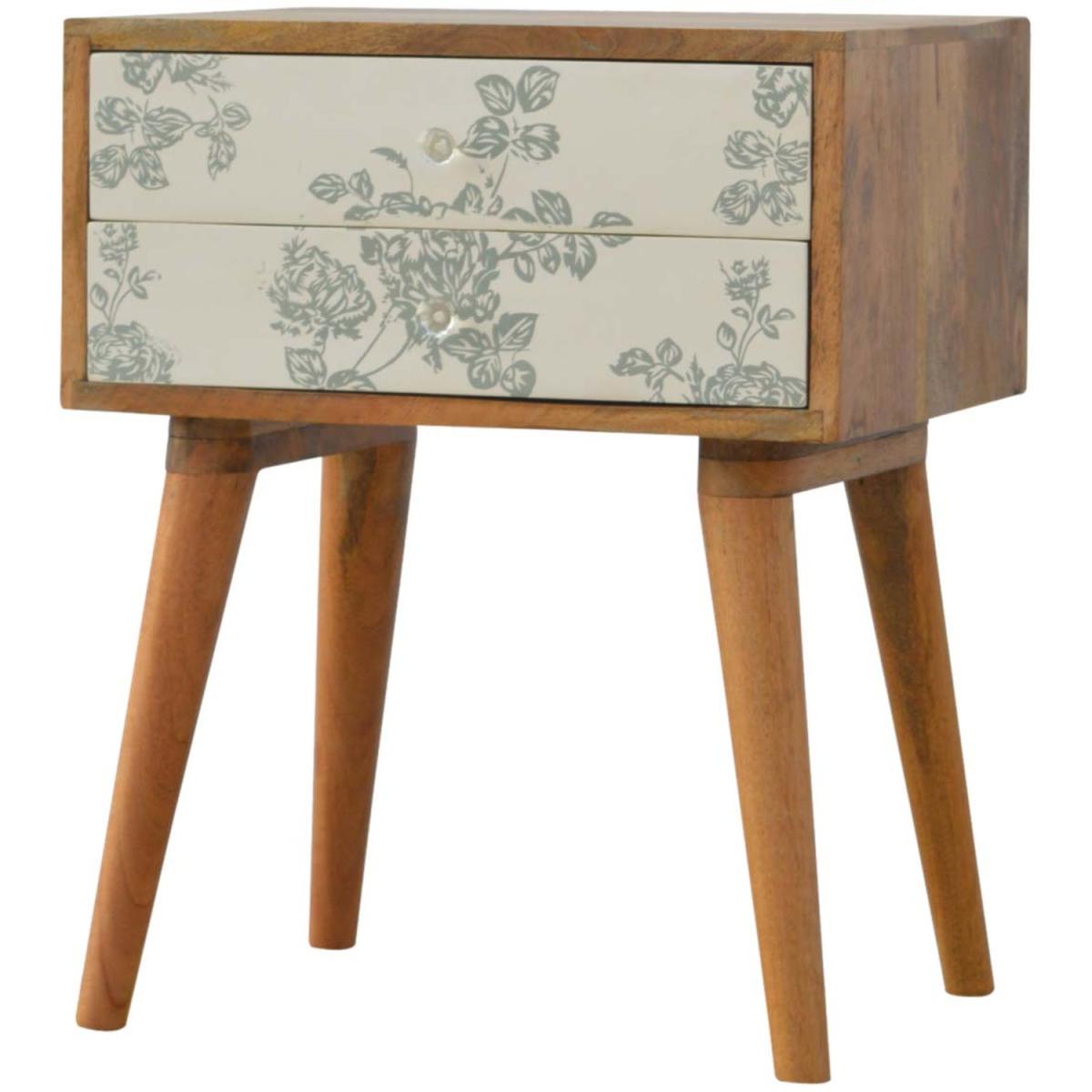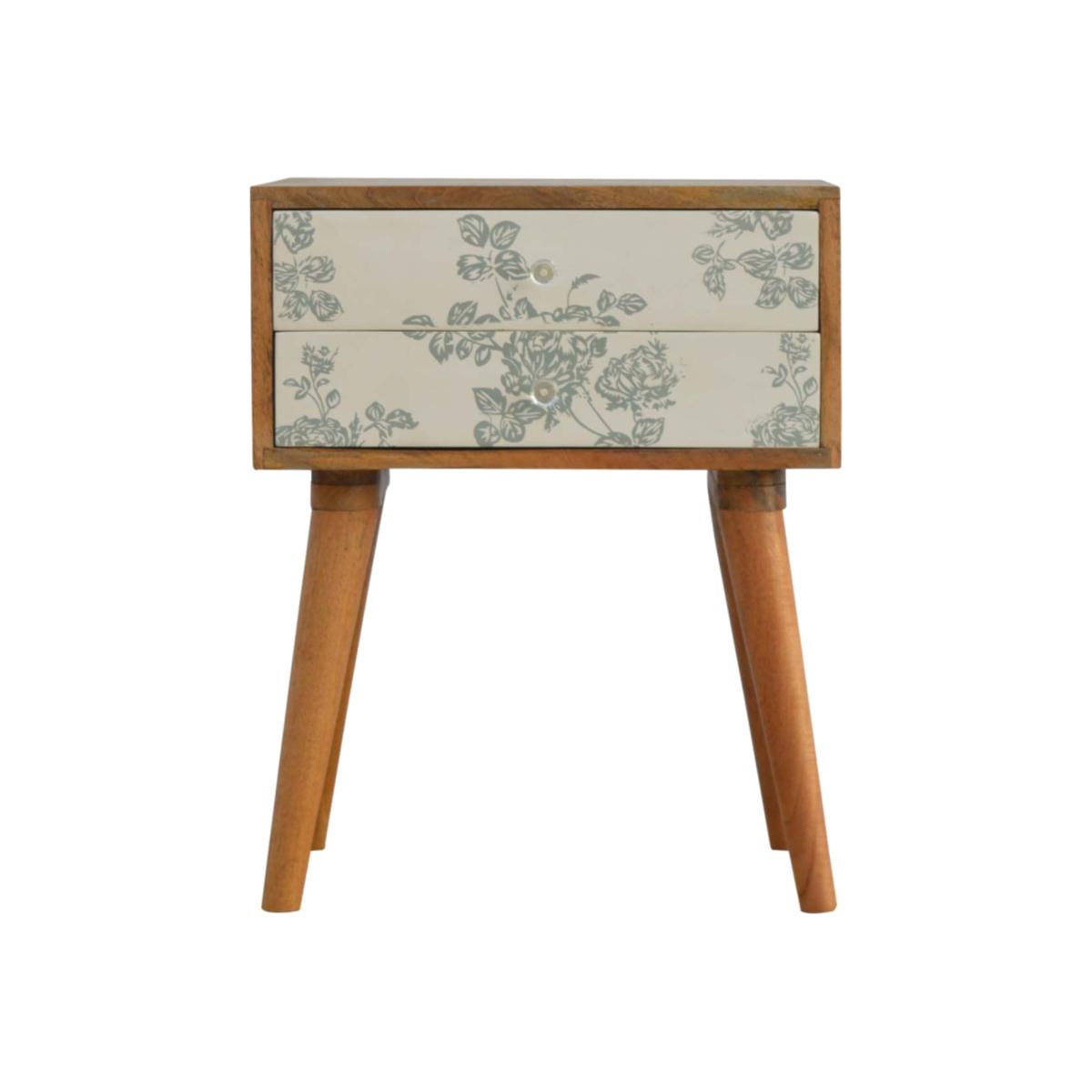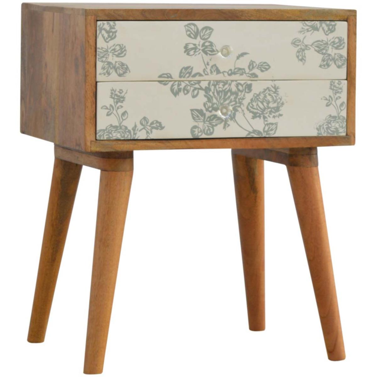 Wood Bedside Table Green Floral Screen Printed With 2 Drawer - Green