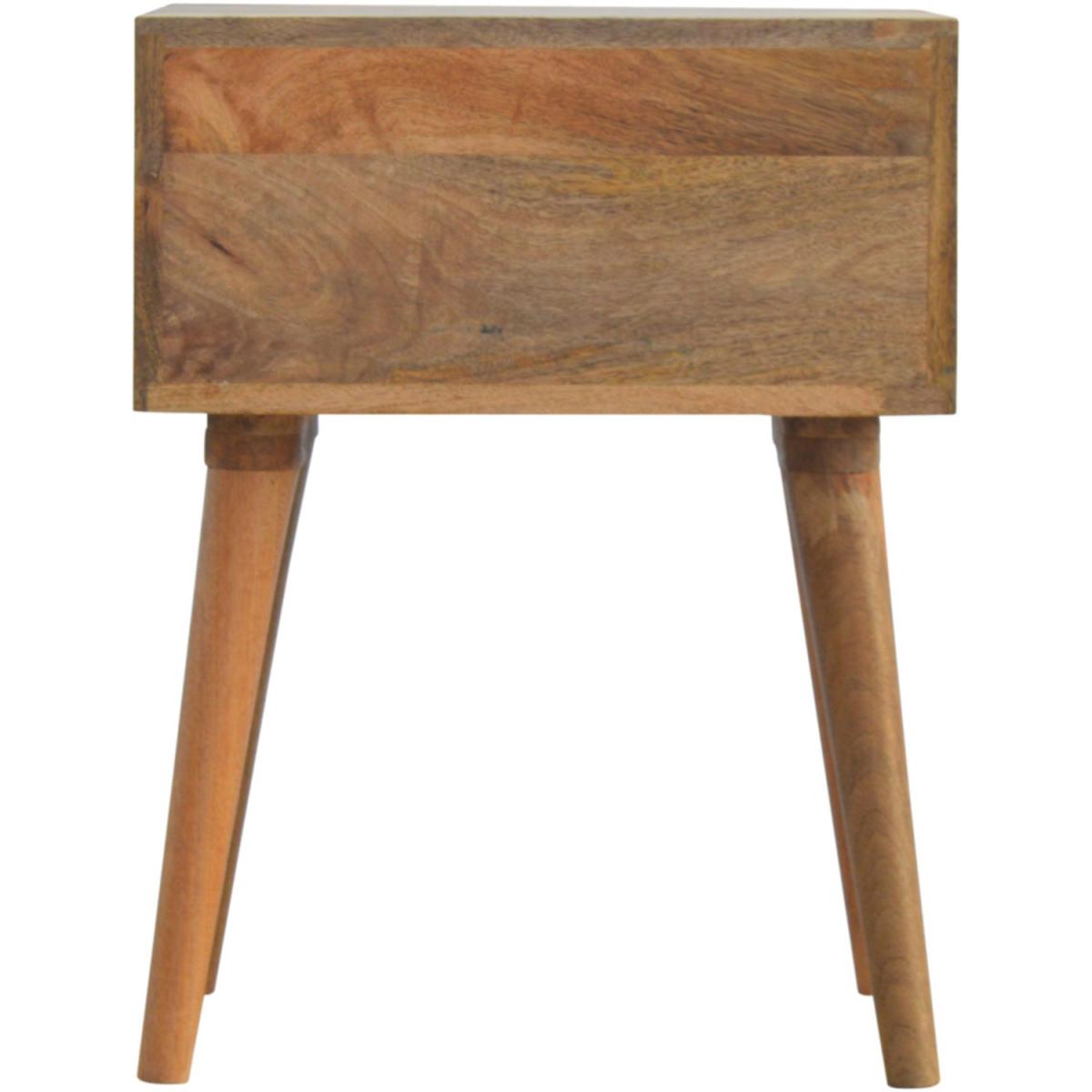 This bedside table is a versatile piece that will prove handy all over your home and provide storage for any bits and pieces before bed. It has been made from 100 solid mango wood with has a fine oak-ish finish. It also comes with 2 green floral screen printed drawers that have glass knobs and 4 Nordic style legs.