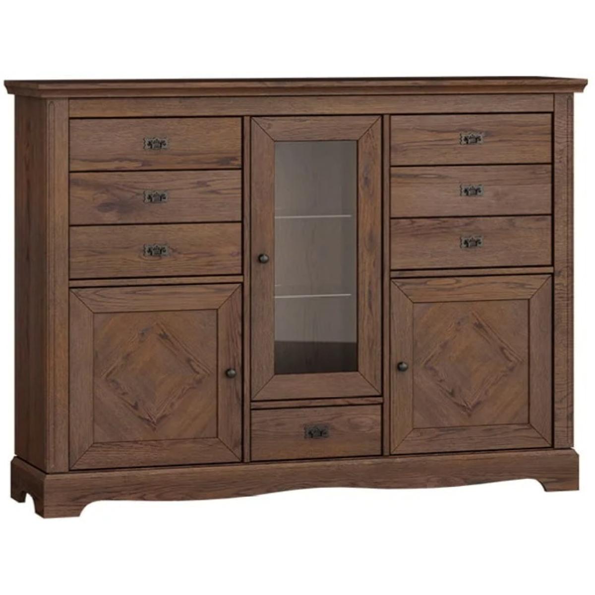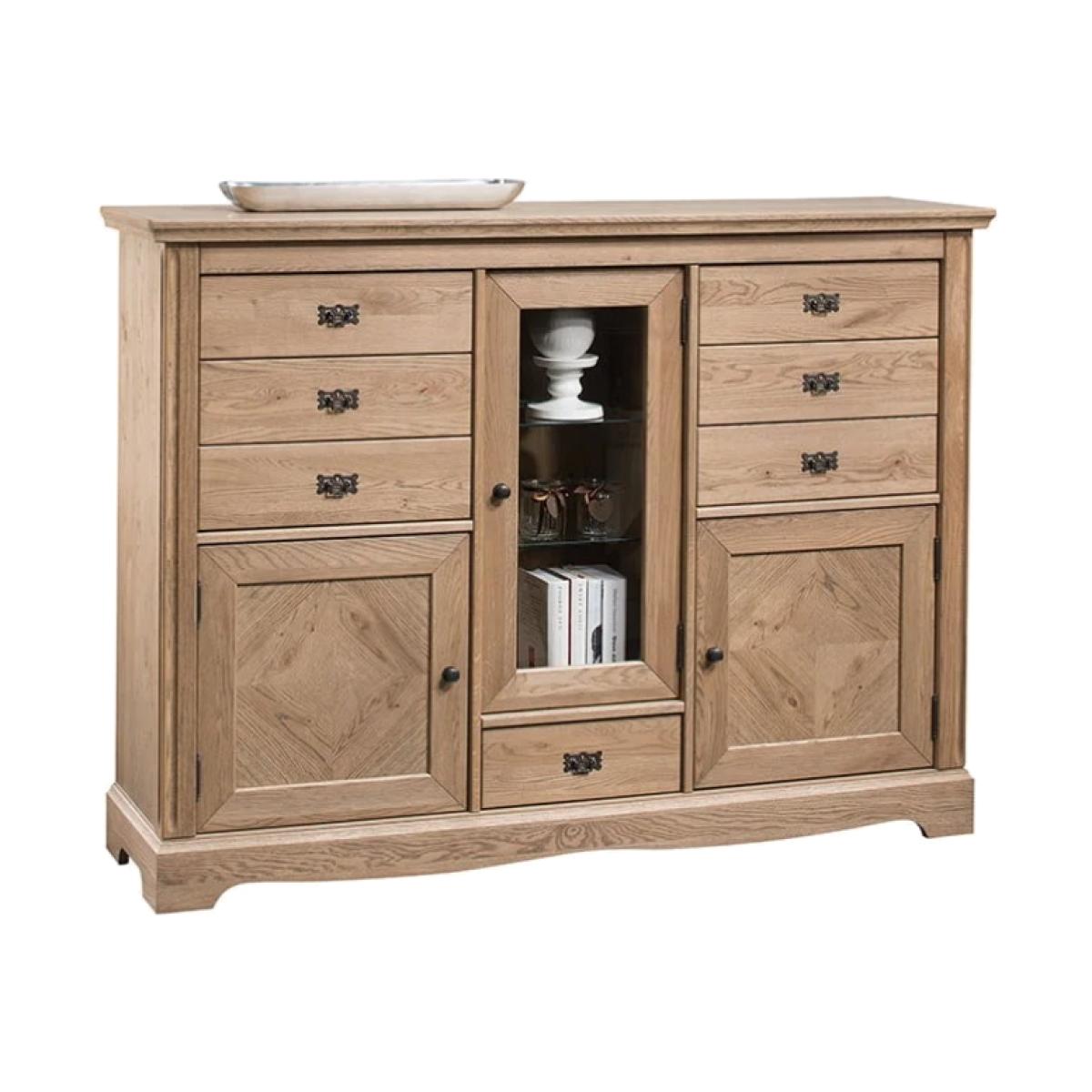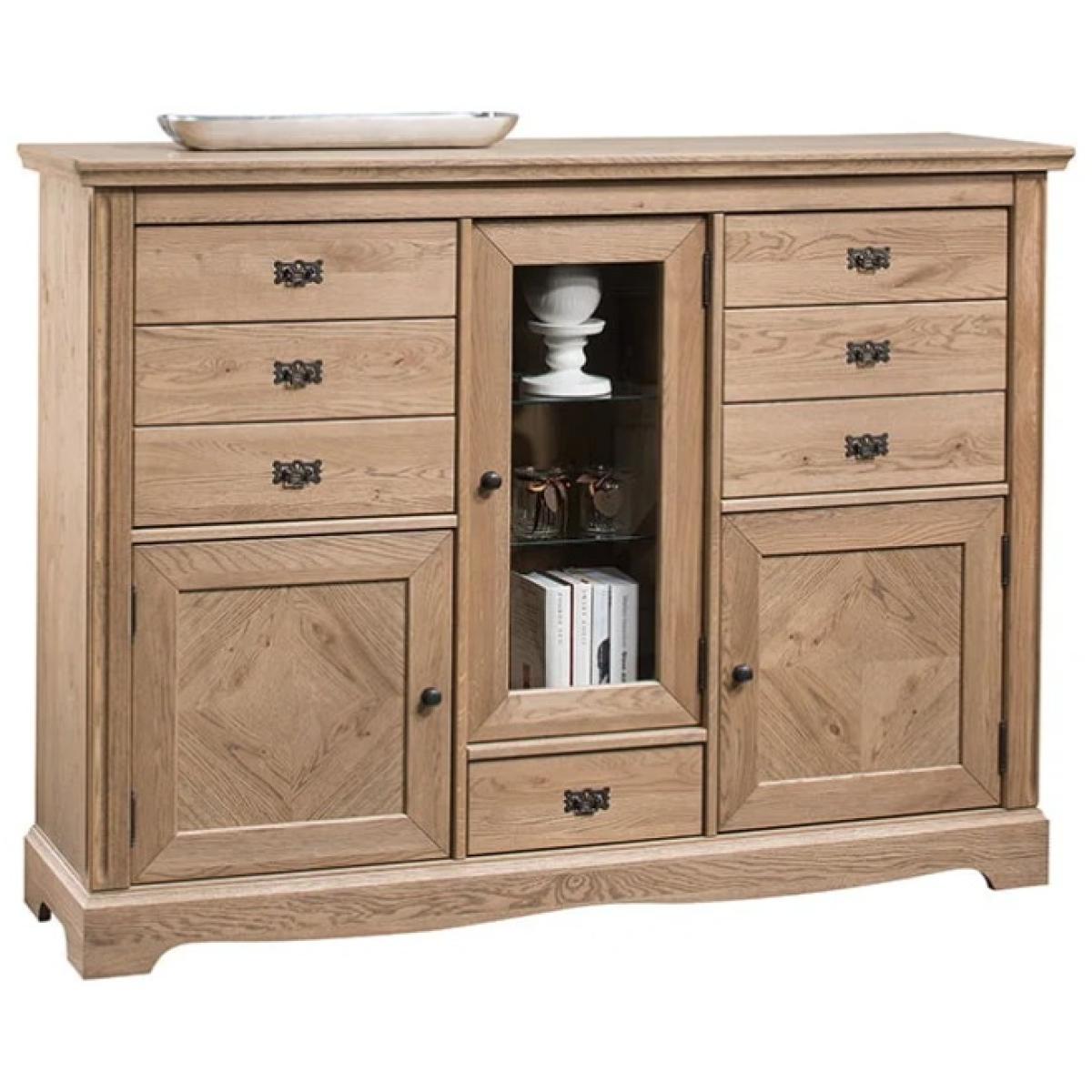 Refresh your home with the new classic country house collection, The Henley. The Henley Highboard presents an impactful addition to any dining or kitchen with substantial storage and presentation space for a wide range of accessories, ornaments and dining related items. This stunning highboard is 159cm wide, 117 cm high and 40cm deep. Featuring geometric parquet detailing on the door fronts, fluting, mitred panels and ornate metal drop handles on the drawers. The central glass fronted cabinet includes 2-point lighting lighting your ornaments beautifully. Popular for kitchens or dining spaces, this highboard is available in either aged oak or antique oak finishes Comprising 7 wood drawers, 2 wood doors and 1 wood frame and glass fronted door (all soft closing) Available in Aged Oak or Antique Oak. Height: 117cm Width: 159cm Depth: 40cm Image 1 displays the Henley Highboard in Aged Oak Image 2 displays the Henley Highboard in Antique Oak All screens vary in colour reproduction and whilst every effort has been made to display the colour as accurately as possible it is for guidance only.