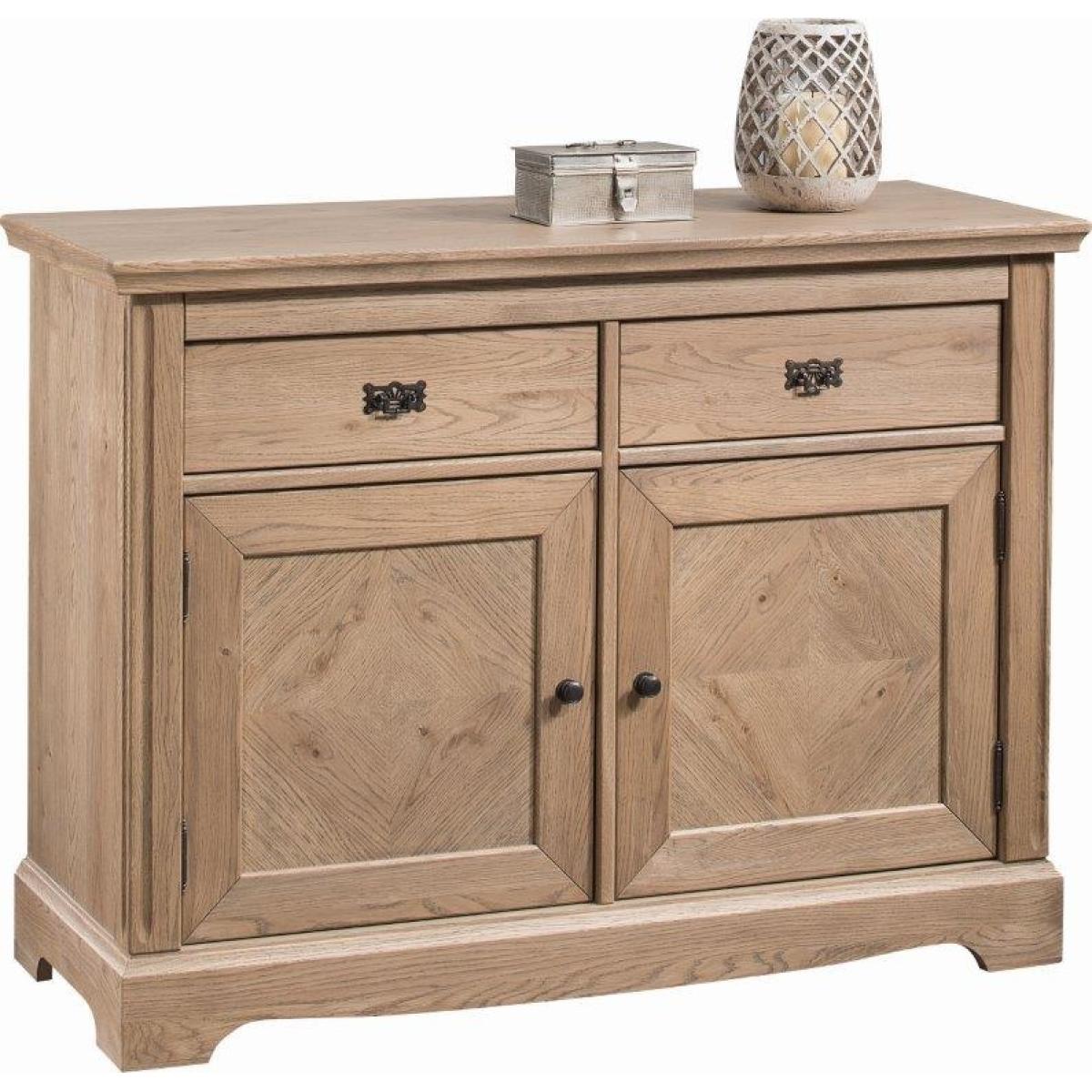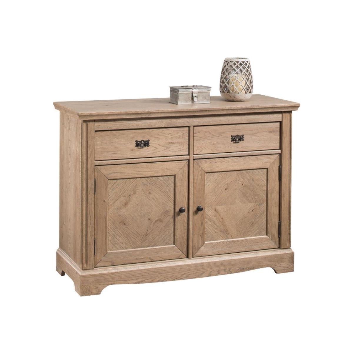Refresh your home with the new classic country house collection, The Henley. The cabinet pieces feature geometric parquet detailing on the door fronts and ornate metal drop handles. Fluting, mitred panels and soft-close doors and drawers are also featured across all cabinet. The Two Bay Sideboard consists of 2x wood drawers and 2x wood doors + natural oak veneers. Available in Aged Oak or Antique Oak. Height: 88cm Width: 119cm Depth: 45cm All screens vary in colour reproduction and whilst every effort has been made to display the colour as accurately as possible it is for guidance only.