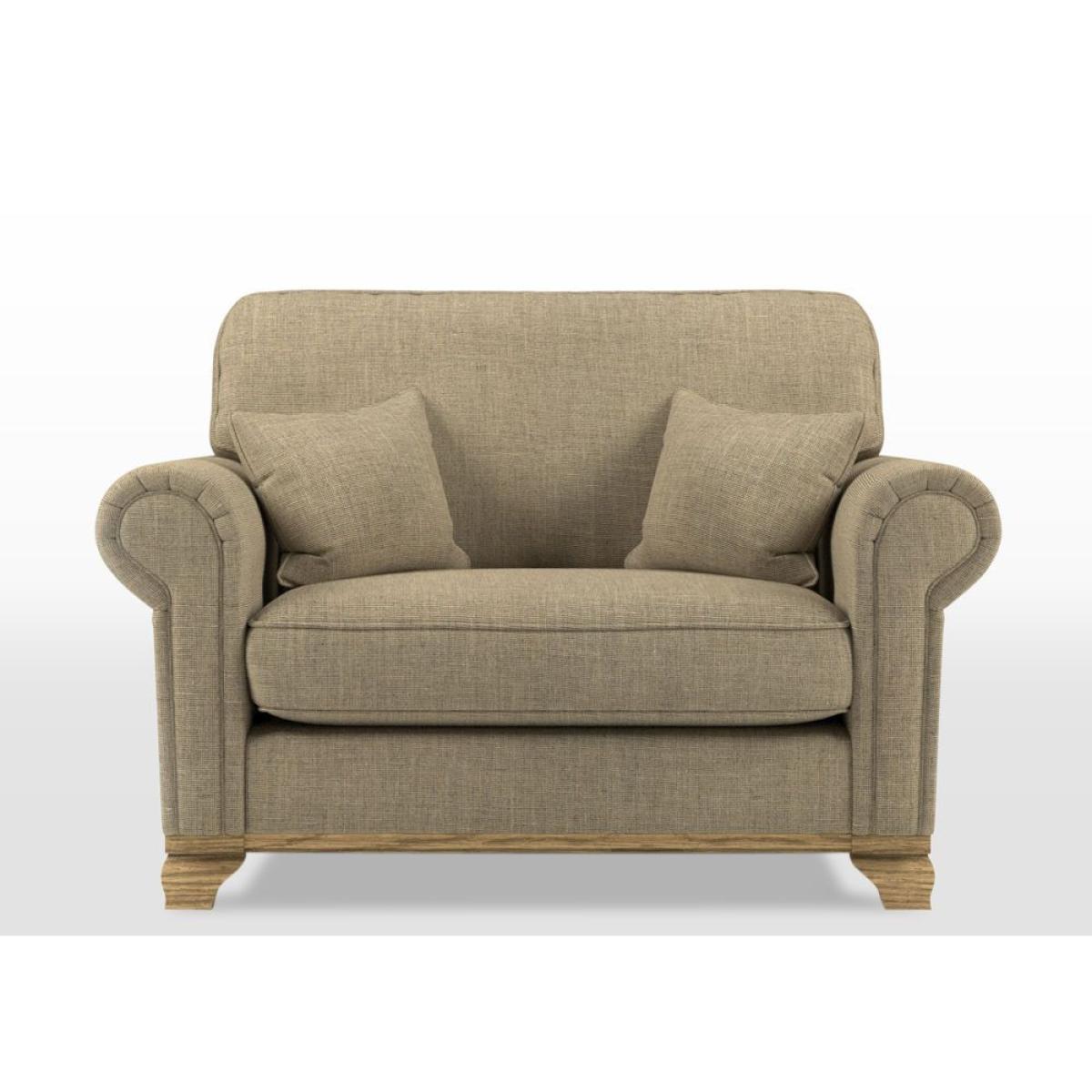 The Lavenham Love Seat features a formal back cushion, scroll arms and includes two small scatter cushion. Available with a traditional plinth base in any of the Wood Bros colourways. The Love Seat comes as standard with foam and fibre seat cushion. The Lavenham Love Seat will work well on its own, but with complementary proportions and features they are designed to look even better as a group. Hardwood frame with 10 year guarantee. The wool options are 100% Wool. Wool is stain resistant and has a protective outer layer. Wool is naturally flame retardant. Wool is colourfast when it is dyed which offers a wide scope of colour options. Frame - Seasoned and kiln dried beech and other hardwoods from managed sources. Hand crafted with triple or double dowelled joints, glued and screwed. Seat suspension - Serpentine Springs. Back suspension - Serpentine Springs. Seat interiors - foam core with a spun Dacron wrap. Dimensions: W 142 x D 95 x H 98cm. British Design Available in all Wood Bros Fabric & Leathers Feet available in all Wood Bros wood colours Images shown in Finchley Natural *Please note - All screens vary in colour reproduction and whilst every effort has been made to display the colour as accurately as possible it is for guidance only.