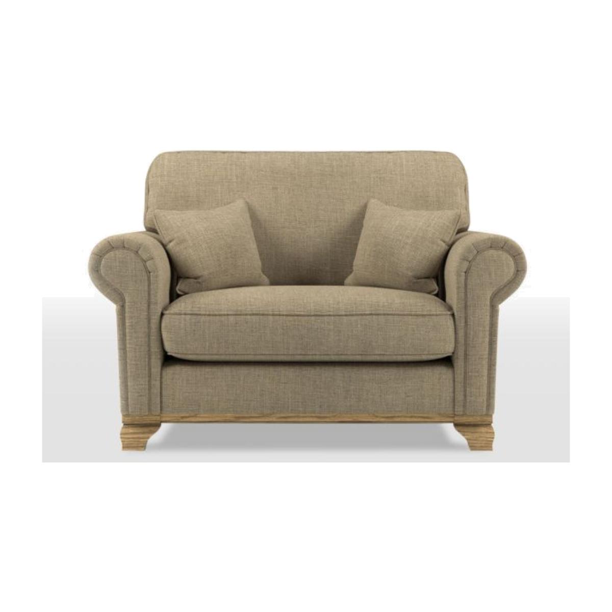 The Lavenham Love Seat features a formal back cushion, scroll arms and includes two small scatter cushion. Available with either a turned foot or a traditional plinth in any of the Wood Bros colourways. The Love Seat comes as standard with foam seat cushion or upgrade to a pocket sprung seat cushionproviding a firmer sit and is more supportive. The Lavenham Love Seat will work well on its own, but with complementary proportions and features they are designed to look even better as a group. Images shown in Finchley Natural - No Leather images available. *. Please note -. All screens vary in colour reproduction and whilst every effort has been made to display the colour as accurately as possible it is for guidance only.