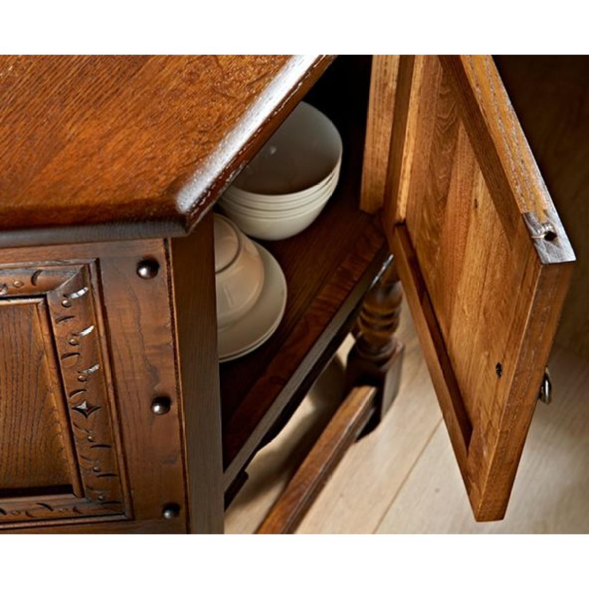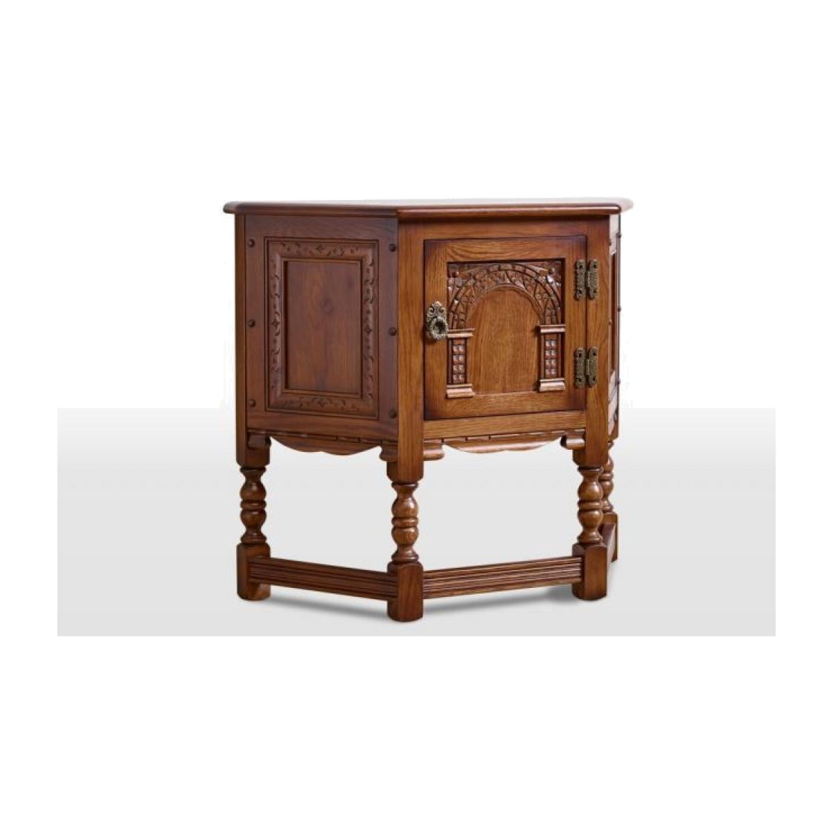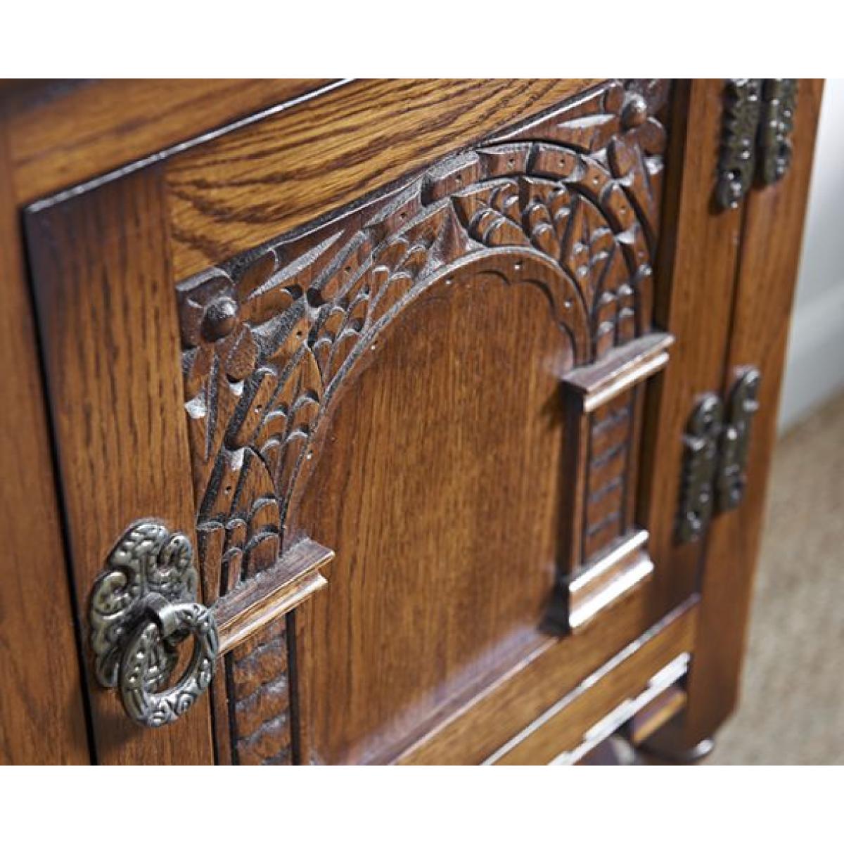 This Canted table is a deceptively compact occasional cabinet that would be a practical addition for a hall way or sitting room. It features a large storage cupboard. The Canted table is also beautifully designed, featuring traditional carving on each side with an impressively ornate Tudor Arch on the front panel. Scratch beading and chop carving complete the look. Traditional in style, authentic in character, and a beautiful choice for any style of home, the Old Charm collection of living room occasional and storage pieces and dining room tables and chairs draws inspiration from England's golden years of furniture design and cabinet making. Using only the finest quality materials, Old Charm pieces showcase turned legs, carved embellishments, secret storage compartments and metal hardware. Classic in style and wonderfully well-crafted, Old Charm makes a return to the living and dining rooms of a bygone era an effortless pleasure. Dimensions:W 81 x D 33 x H 71cm Made in England. Fully assembled. * Please note: The oak used is full of knots and gnarls and we are proud to say that no piece of Old Charm furniture is ever alike! The rustic grade oak is known for its character, fine open grain, durability and ideal for day to day living. The perfect material for showcasing these designs.