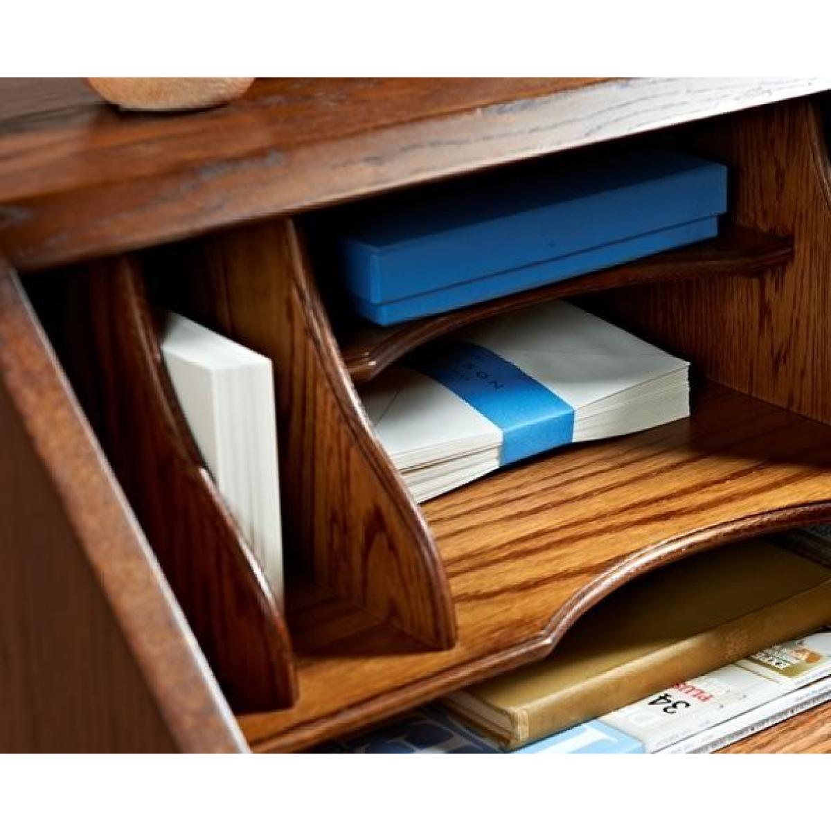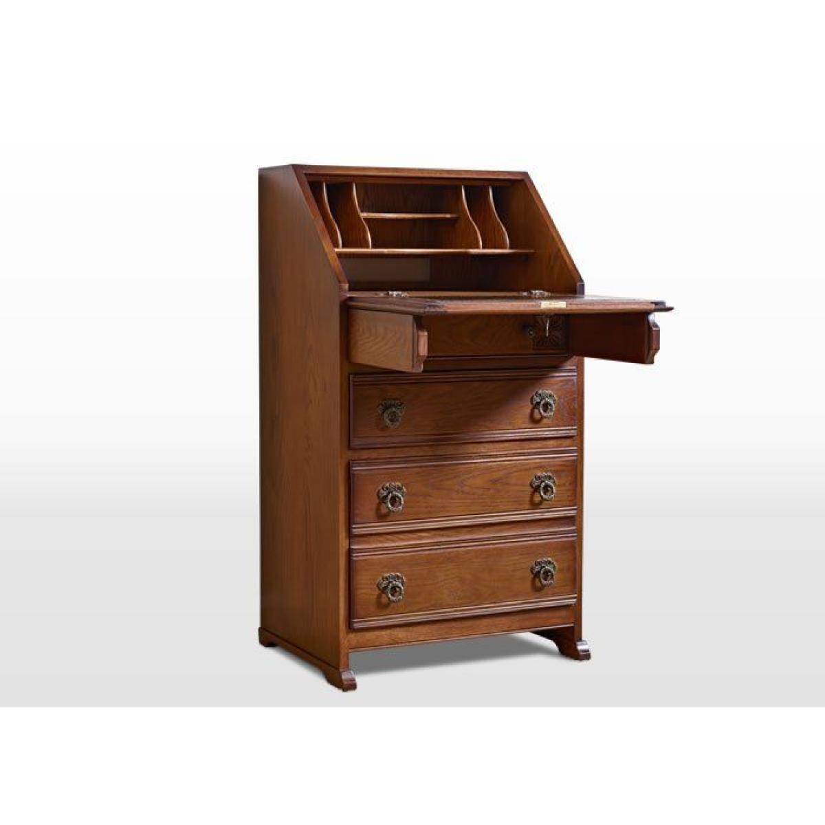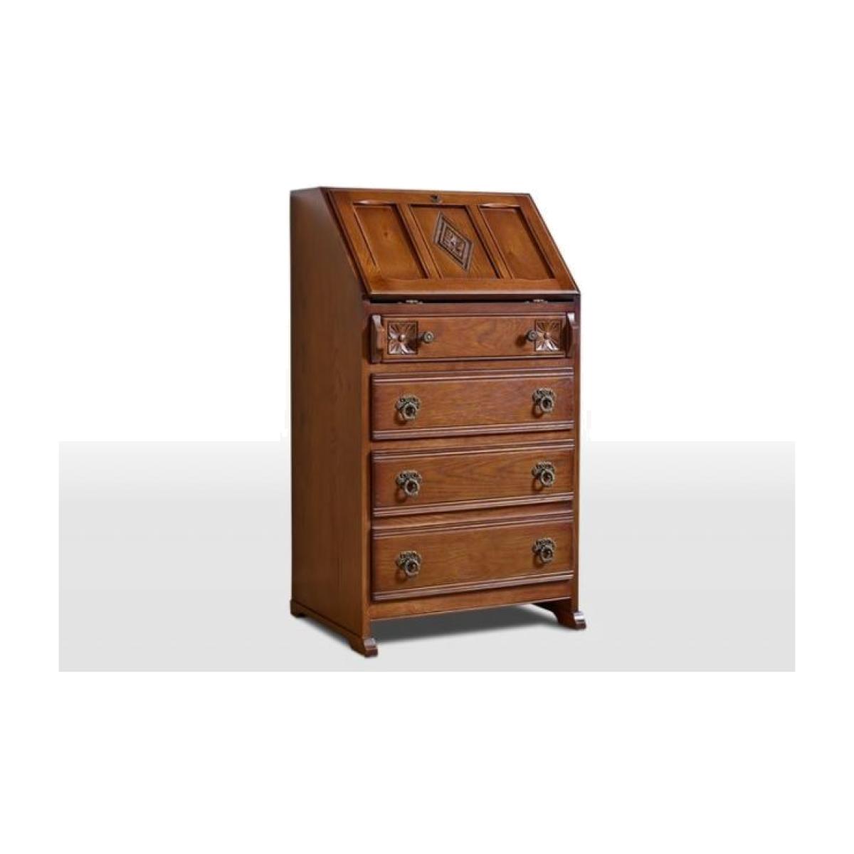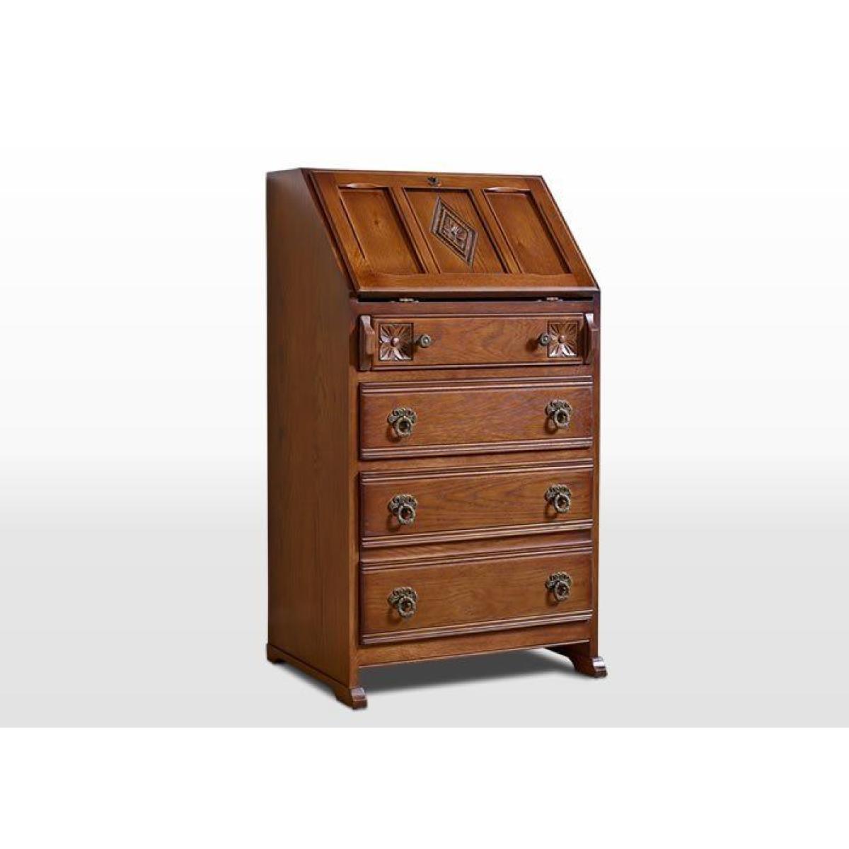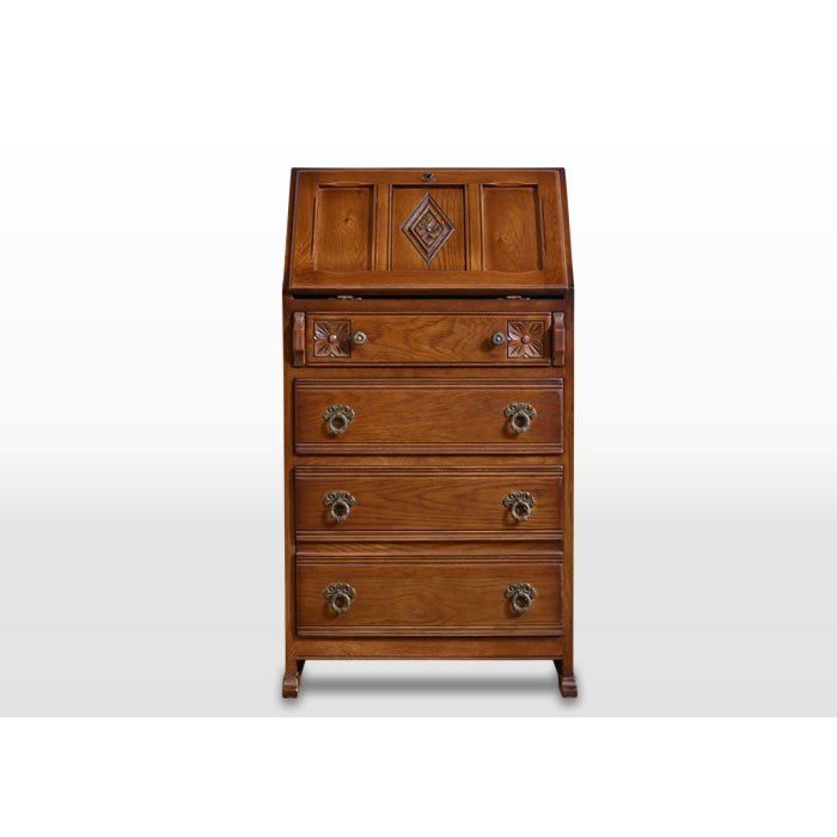 The Wood Bros Old Charm Ladies Bureau is unique in a number of ways.. not only is it a small and beautiful writing desk but it also features a deceptively large filing drawer, stationery drawer, internal shelving and cable management! Internal shelving and drawers will help organise personal belongings, i. Pads or paperwork. Traditional in style, authentic in character, and a beautiful choice for any style of home, the Old Charm collection of living room occasional and storage pieces and dining room tables and chairs draws inspiration from England's golden years of furniture design and cabinet making. Using only the finest quality materials, Old Charm pieces showcase turned legs, carved embellishments, secret storage compartments and metal hardware. Classic in style and wonderfully well-crafted, Old Charm makes a return to the living and dining rooms of a bygone era an effortless pleasure. Dimensions: W 55 x D 43 x H 100cm. Made in England. Fully assembled. * Please note: The oak used is full of knots and gnarls and we are proud to say that no piece of Old Charm furniture is ever alike! The rustic grade oak is known for its character, fine open grain, durability and ideal for day to day living. The perfect material for showcasing these designs.