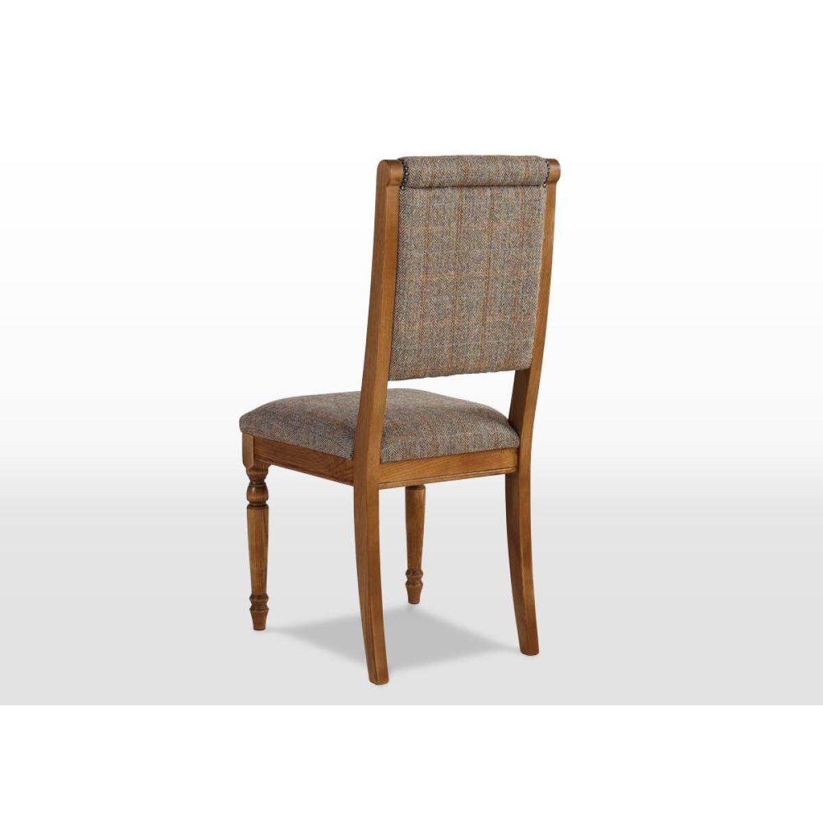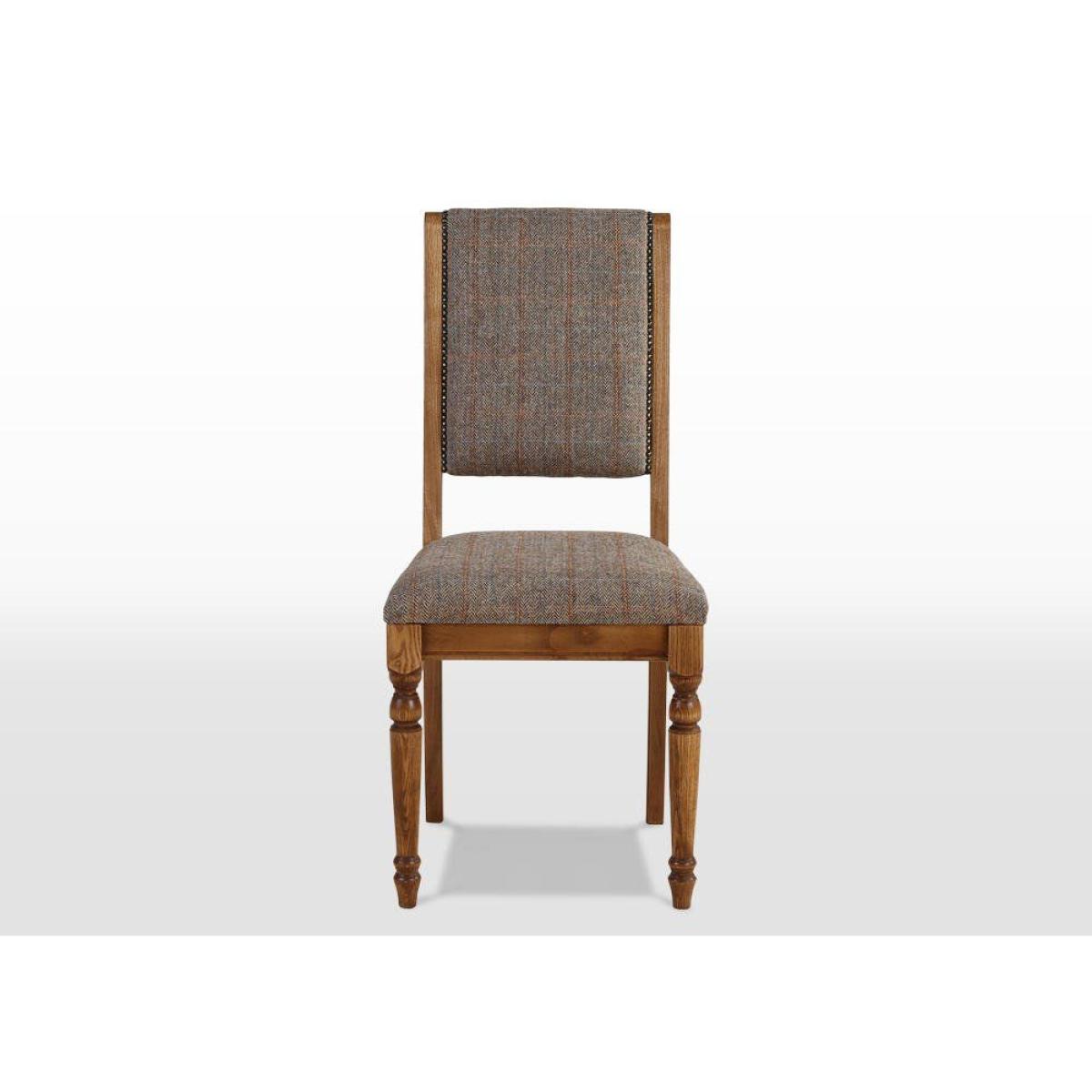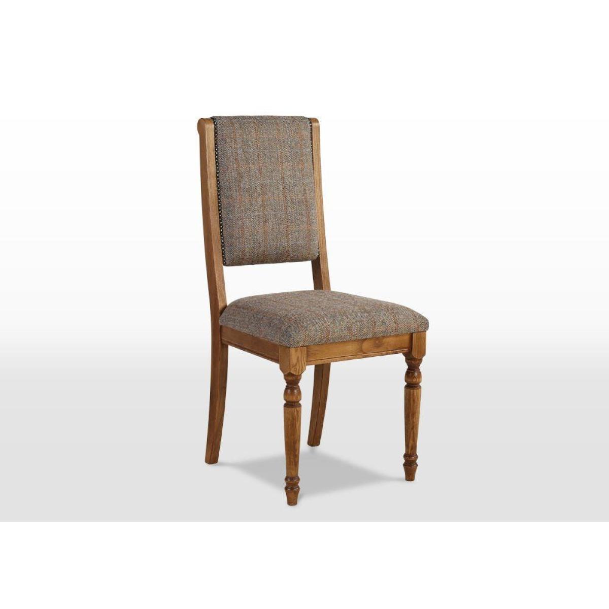 Add a statement to your dining room with this Wood Bros Old Charm Dining Chair. It is a high backed wooden frame design and has a comfy leather upholstered seat and elegant studded back. The Wood Bros design team have taken a traditional chair and made it comfortable and elegant. It features sleek lines and shaped legs. Traditional in style, authentic in character, and a beautiful choice for any style of home, the Old Charm collection of living room occasional and storage pieces and dining room tables and chairs draws inspiration from England's golden years of furniture design and cabinet making. Using only the finest quality materials, Old Charm pieces showcase turned legs, carved embellishments, secret storage compartments and metal hardware. Classic in style and wonderfully well-crafted, Old Charm makes a return to the living and dining rooms of a bygone era an effortless pleasure. Dimensions: W 46 x D 52 x H 100cm. Sold individually. Made in England. Fully assembled. * Please note: The oak used is full of knots and gnarls and we are proud to say that no piece of Old Charm furniture is ever alike! The rustic grade oak is known for its character, fine open grain, durability and ideal for day to day living. The perfect material for showcasing these designs. *Please note: the images supplied are for demonstration purposes only and they are displayed with fabric upholstered seats. The product on this page comes with Leather upholstered seats.