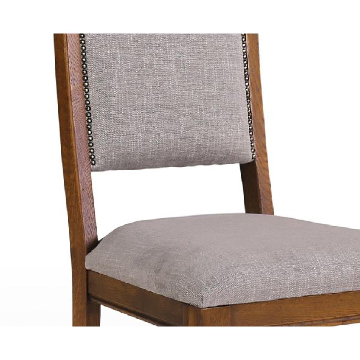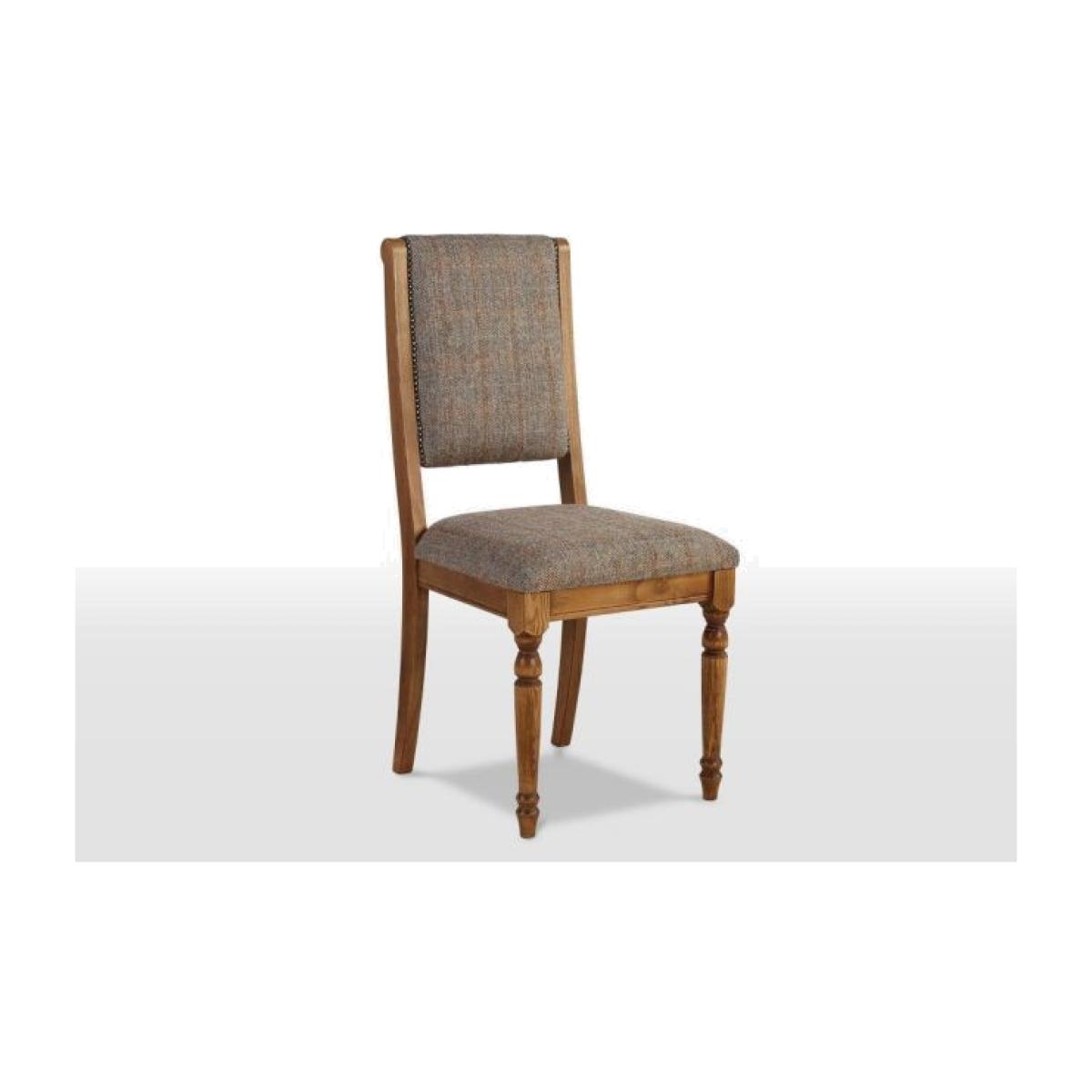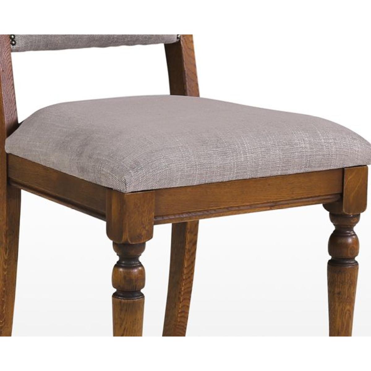 Add a statement to your dining room with this Wood Bros Old Charm Dining Chair. It is a high backed wooden frame design and has a comfy leather upholstered seat and elegant studded back. The Wood Bros design team have taken a traditional chair and made it comfortable and elegant. It features sleek lines and shaped legs. Traditional in style, authentic in character, and a beautiful choice for any style of home, the Old Charm collection of living room occasional and storage pieces and dining room tables and chairs draws inspiration from England's golden years of furniture design and cabinet making. Using only the finest quality materials, Old Charm pieces showcase turned legs, carved embellishments, secret storage compartments and metal hardware. Classic in style and wonderfully well-crafted, Old Charm makes a return to the living and dining rooms of a bygone era an effortless pleasure. Dimensions: W 46 x D 52 x H 100cm. Sold individually. Made in England. Fully assembled. * Please note: The oak used is full of knots and gnarls and we are proud to say that no piece of Old Charm furniture is ever alike! The rustic grade oak is known for its character, fine open grain, durability and ideal for day to day living. The perfect material for showcasing these designs. *Please note: the images supplied are for demonstration purposes only and they are displayed with fabric upholstered seats. The product on this page comes with Leather upholstered seats.