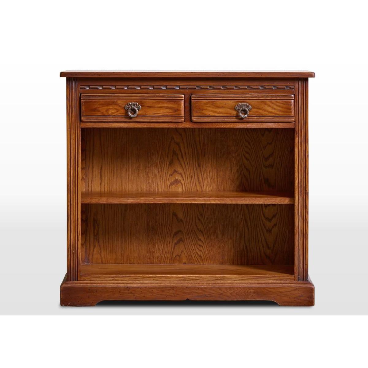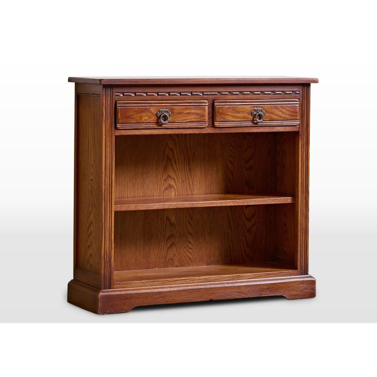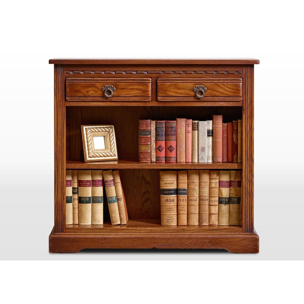The Wood Bros Old Charm Low Open Bookcase With Drawers offers display and storage space. It is supplied with an adjustable wooden shelf as well as two drawers. The Bookcase is an elegantly proportioned design with decoration is kept to a minimum with chop carving and scratch beading down the sides. Traditional in style, authentic in character, and a beautiful choice for any style of home, the Old Charm collection of living room occasional and storage pieces and dining room tables and chairs draws inspiration from England's golden years of furniture design and cabinet making. Using only the finest quality materials, Old Charm pieces showcase turned legs, carved embellishments, secret storage compartments and metal hardware. Classic in style and wonderfully well-crafted, Old Charm makes a return to the living and dining rooms of a bygone era an effortless pleasure. Dimensions: W 91.5 x D 30 x H 84cm Made in England. Fully assembled. * Please note: The oak used is full of knots and gnarls and we are proud to say that no piece of Old Charm furniture is ever alike! The rustic grade oak is known for its character, fine open grain, durability and ideal for day to day living. The perfect material for showcasing these designs.