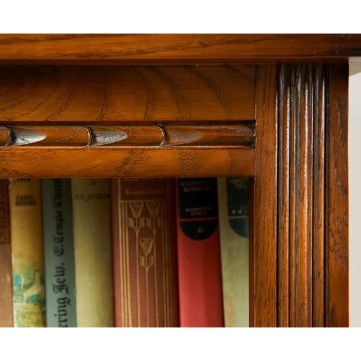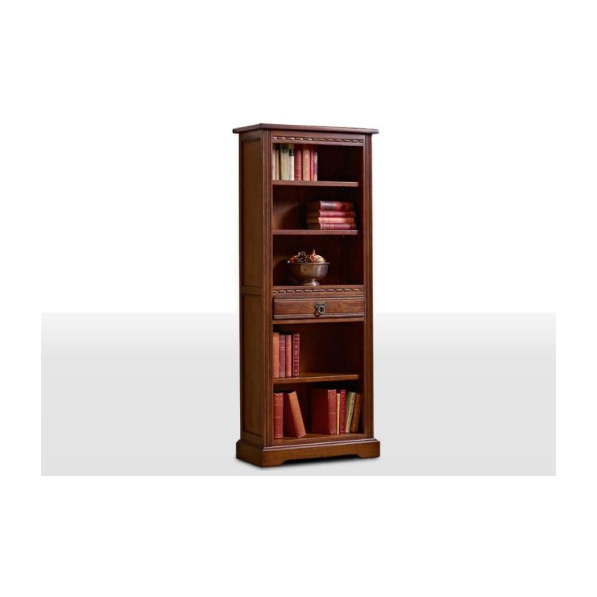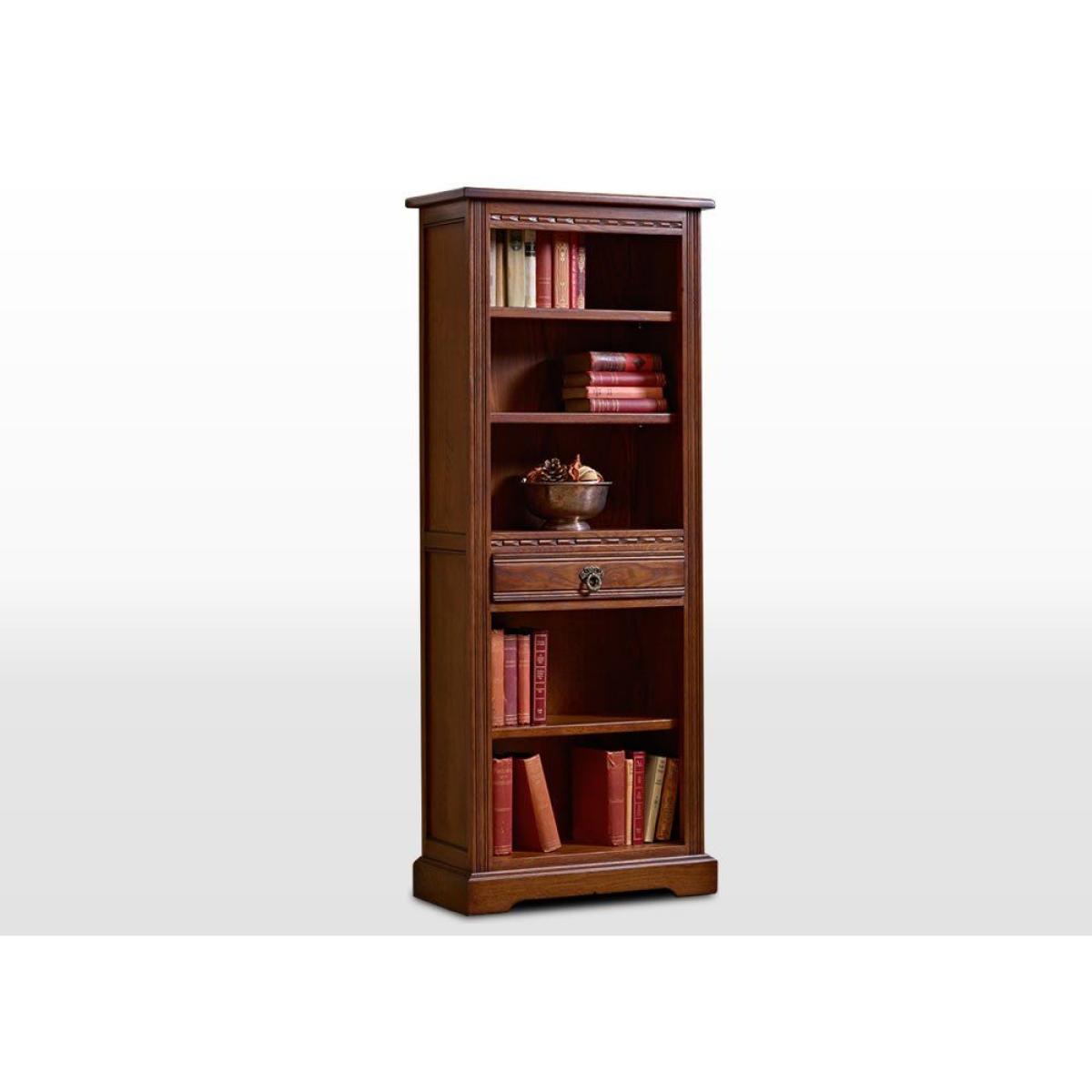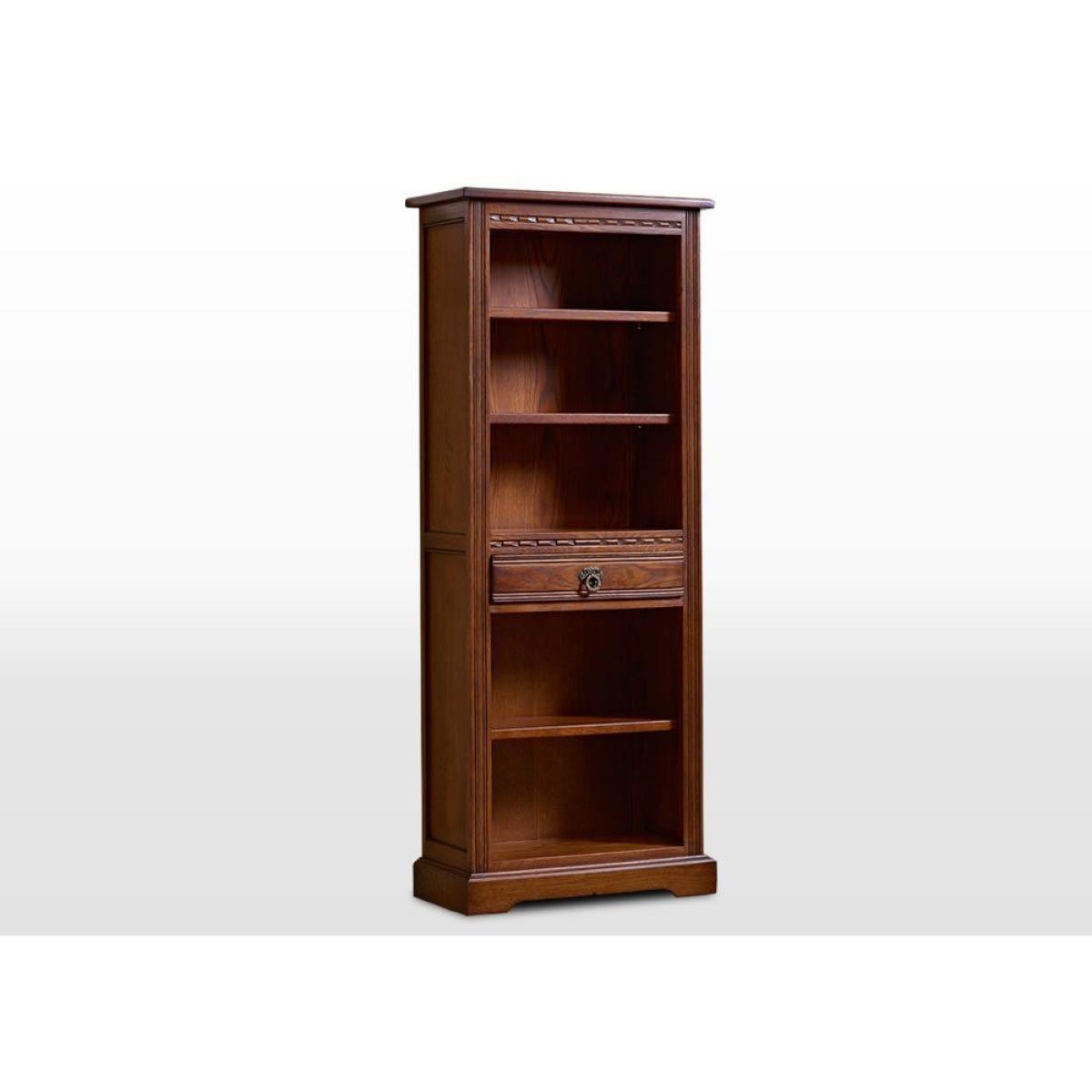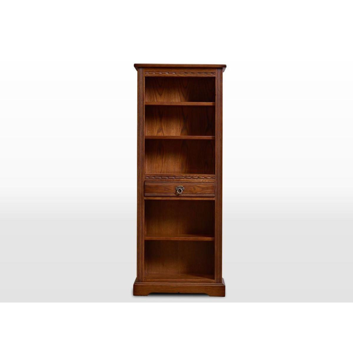 The Wood Bros Old Charm Narrow Bookcase features slim-line proportions which make it ideal for narrow spaces. With three adjustable shelves and a central drawer is covers all display and storage options. Decoration is kept to minimum with chop carving, scratch beading and a shaped plinth. Traditional in style, authentic in character, and a beautiful choice for any style of home, the Old Charm collection of living room occasional and storage pieces and dining room tables and chairs draws inspiration from England's golden years of furniture design and cabinet making. Using only the finest quality materials, Old Charm pieces showcase turned legs, carved embellishments, secret storage compartments and metal hardware. Classic in style and wonderfully well-crafted, Old Charm makes a return to the living and dining rooms of a bygone era an effortless pleasure. Dimensions:W 61 x D 30 x H 153cm Made in England. Fully assembled. * Please note: The oak used is full of knots and gnarls and we are proud to say that no piece of Old Charm furniture is ever alike! The rustic grade oak is known for its character, fine open grain, durability and ideal for day to day living. The perfect material for showcasing these designs.