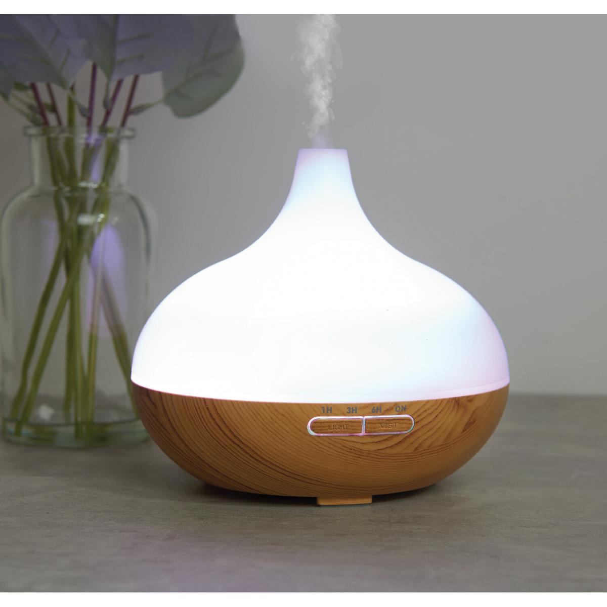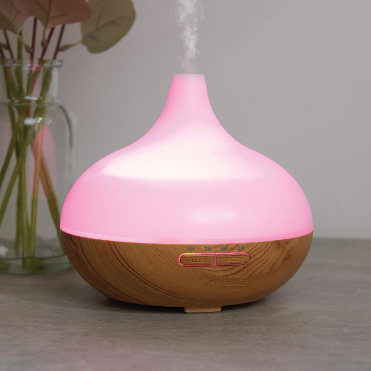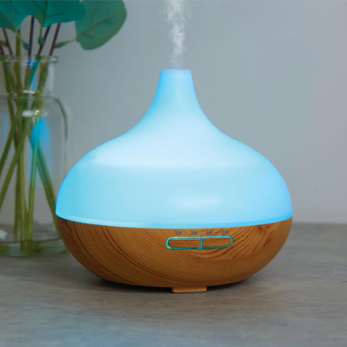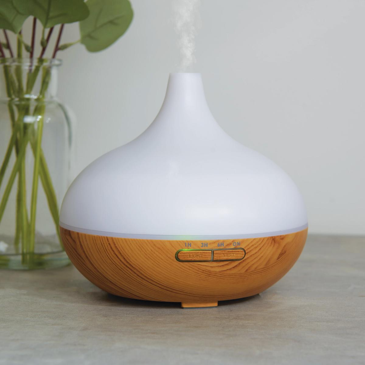 This charming Wood Effect Colour Changing Diffuser helps to create a beautiful ambience with gentle atmospheric lighting. Add scented oils or essential oils to the diffuser to use as an air freshener and create an aromatherapy experience at home. The diffuser creates a fine, cool mist using ultrasound to purify the air. Finished with 6 LED lights with 7 different colours, you can find the right atmosphere for your mood. The mist has run times of 1, 3, or 6 hours with an automatic safety switch off for your peace of mind.