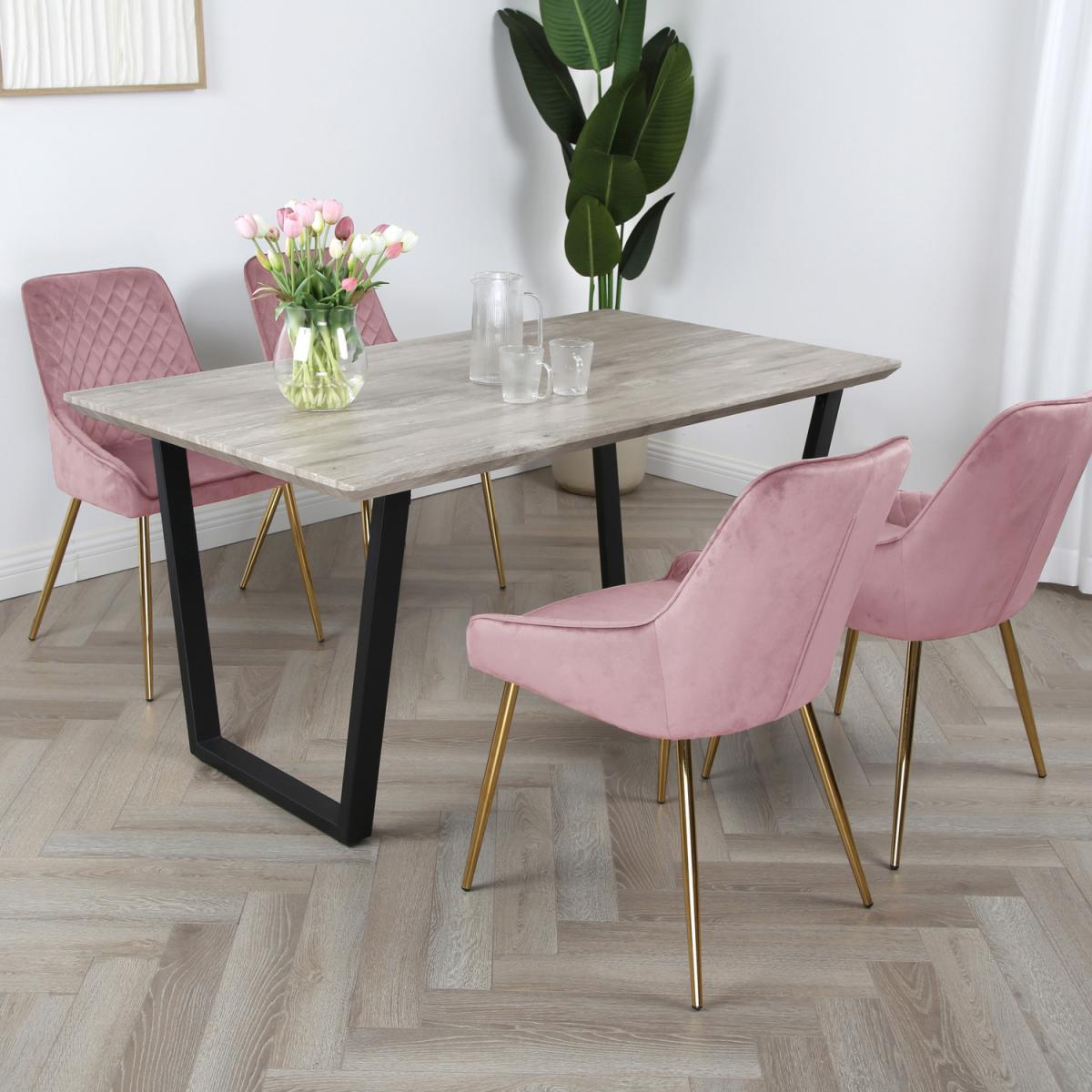 A beautifully built, our 4-seater wood dining table with velvet chairs expertly combines modern style with long-lasting comfort. This dining room set, which includes a table and chairs, is a utilitarian and stylish addition to any dining room. The dining table, an eye-catching centrepiece that can easily seat four people, is the focal point of this dining table and chairs wood set, with steel with black powder coating as material. The table's contemporary design delivers a seamless fusion of strength and aesthetic appeal. Its sleek design and wooden-effect finish perfectly capture the essence of contemporary dining while offering a flexible background for different interior design aesthetics. Invest in our table and chairs dining set, which includes a table and 4 chairs, for a dining area that seamlessly combines contemporary and utility.