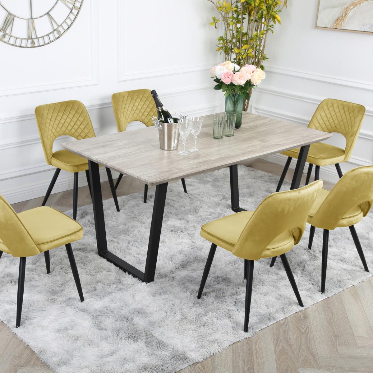Wood-effect Dining Table Set with 6 Metis Velvet Chairs - Olive Yellow
