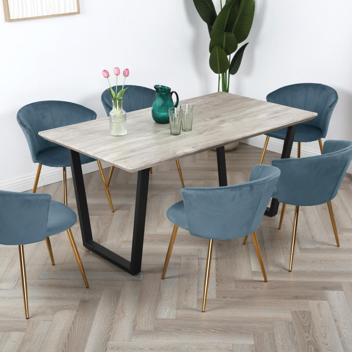 Introducing our 6-seater wood dining set, a unique fusion of beauty and utility that will make your dining space a warm sanctuary for family and guests similar to a wood dining table and chairs kitchen. This dining set offers an outstanding mix of durability and elegance, making it an essential addition to your house. It comes with a wooden-effect dining table and velvety velvet chairs. The wood dining table is the centrepiece of this dining set. It is expertly crafted and emanates sophistication and charm that never goes out of style, with steel with black powder coating as material. The wood grain finish gives your dining area a cosy feel while also enhancing its visual attractiveness. This table is perfect for hosting friends and dining with family because it has a large surface that fits six people. Our dining chairs are made with comfort and style in mind.