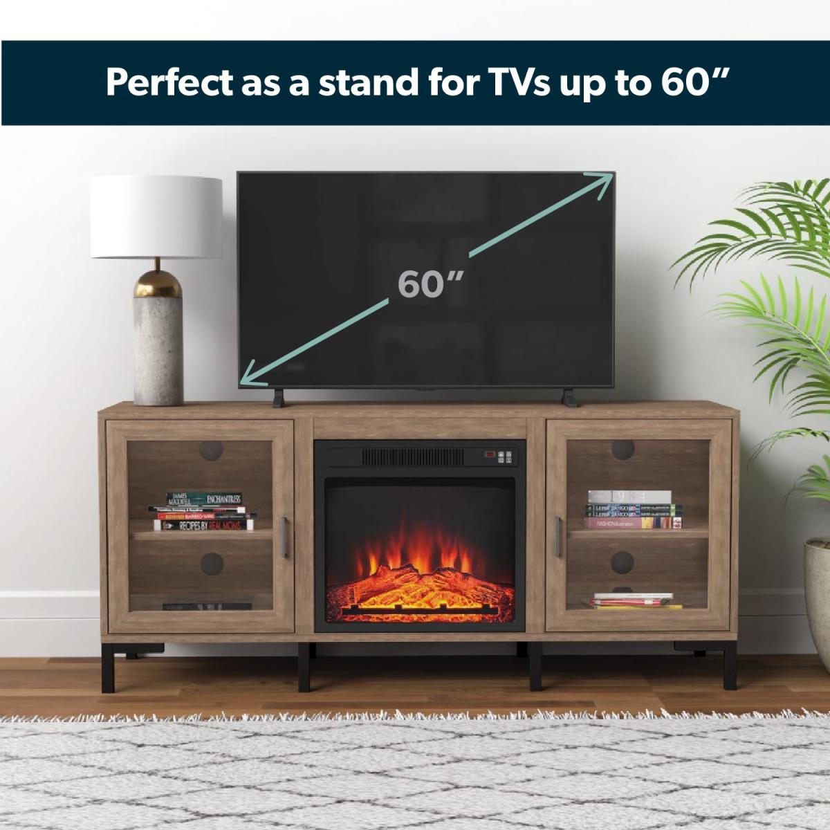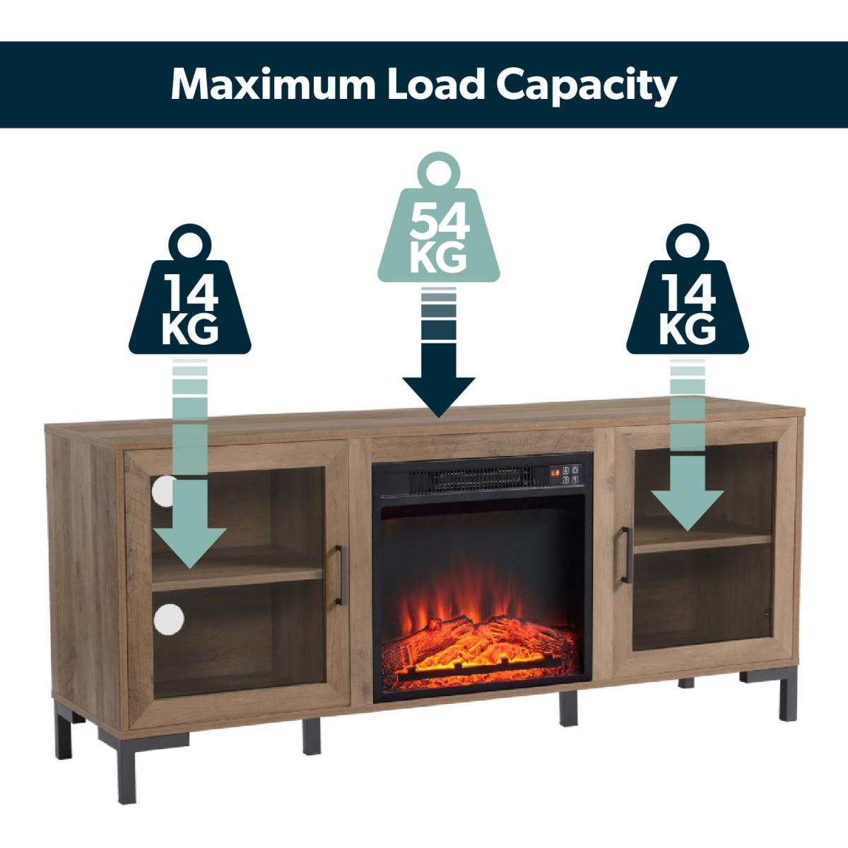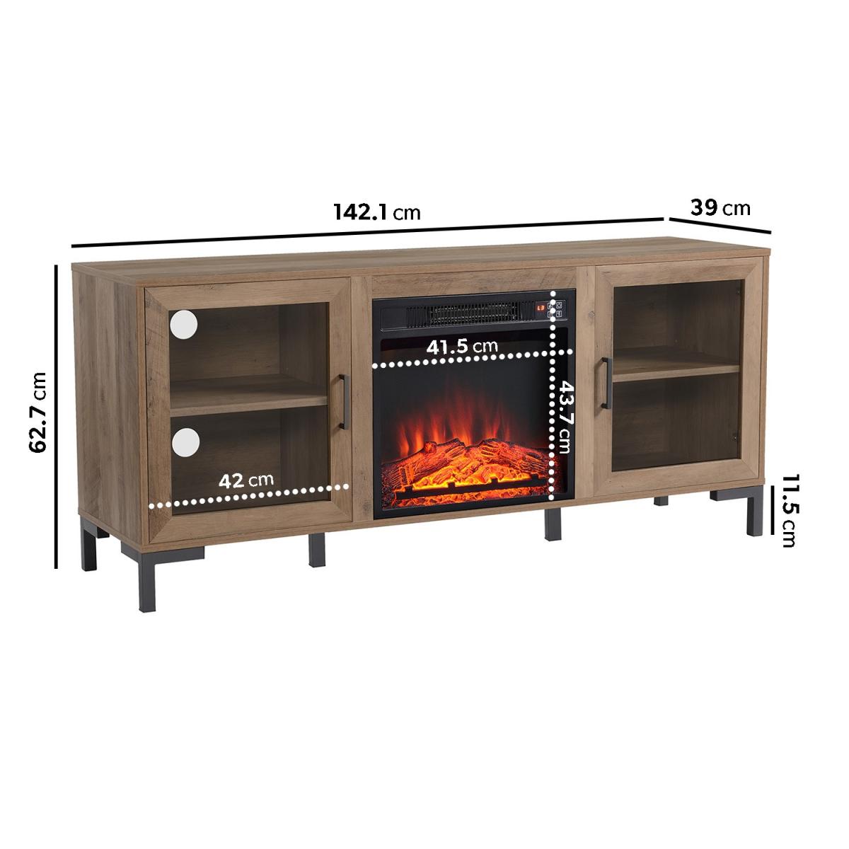 Features we love Built-in electric fireplace TV Stand and; storage in one Industrial feel with rustic wood finish and metal legs. With cable holes to house your entertainment devices. Includes a remote-control device for easy use3 energy saving LED flame effect with or without heat All about me. Enhance your living space with this industrial-inspired TV stand which includes a built-in fireplace and lots of storage space. The TV stand fits a TV up to 60” it features cabinets each with a central shelf and a closing door and the fireplace come in super handy when the temperature drops. You can use the remote control included to make changes without getting up from your sofa. And with the timer you can set your fire to turn on just in time for your arrival home. With three brightness settings on the fire you can instantly bring a warm ambience to your space. Need to know. Overall dimensions. W142.1 x H62.7 x D39 cm Overall weight. 31.6kg Number of cupboards. 2 Number of shelves. 2) Number of legs. 4 TV size. Up to 60 Door style. Hinged Fireplace temperature range. 17- 27⁰C Heat source area. Up to 400 square feet Fireplace cable length. 1.6m Colour. Rustic wood effect and black Unit finish. Laminate Unit material. MDF and metal Assembly required. Yes. Energy efficient LED technology flame and operates with or without heat Remote control with one CR2025 battery included.