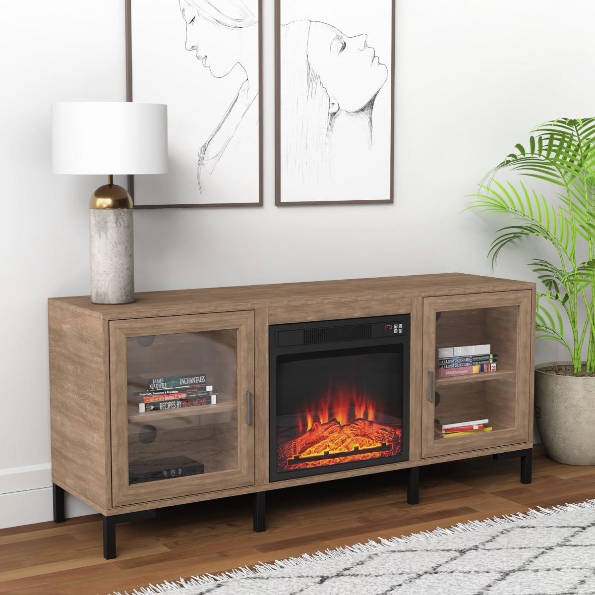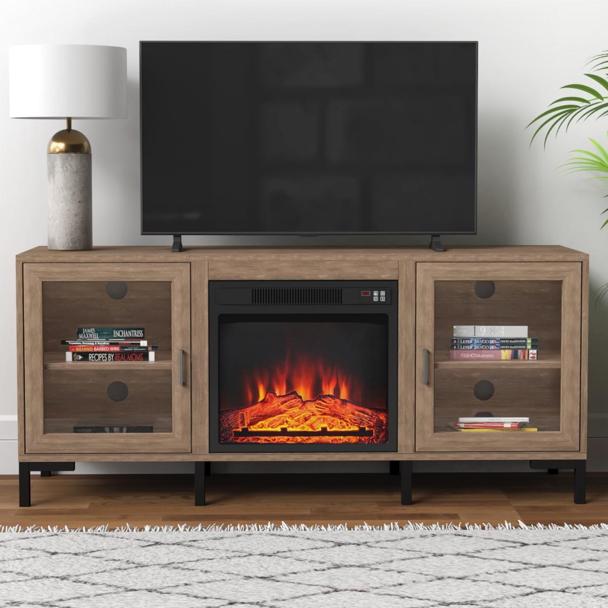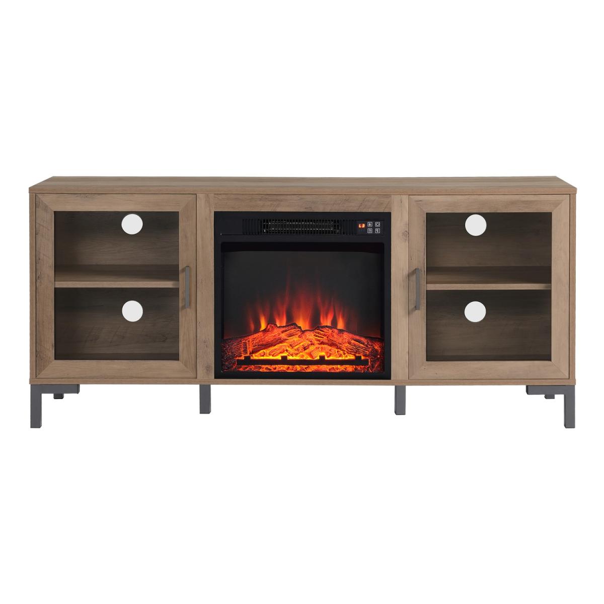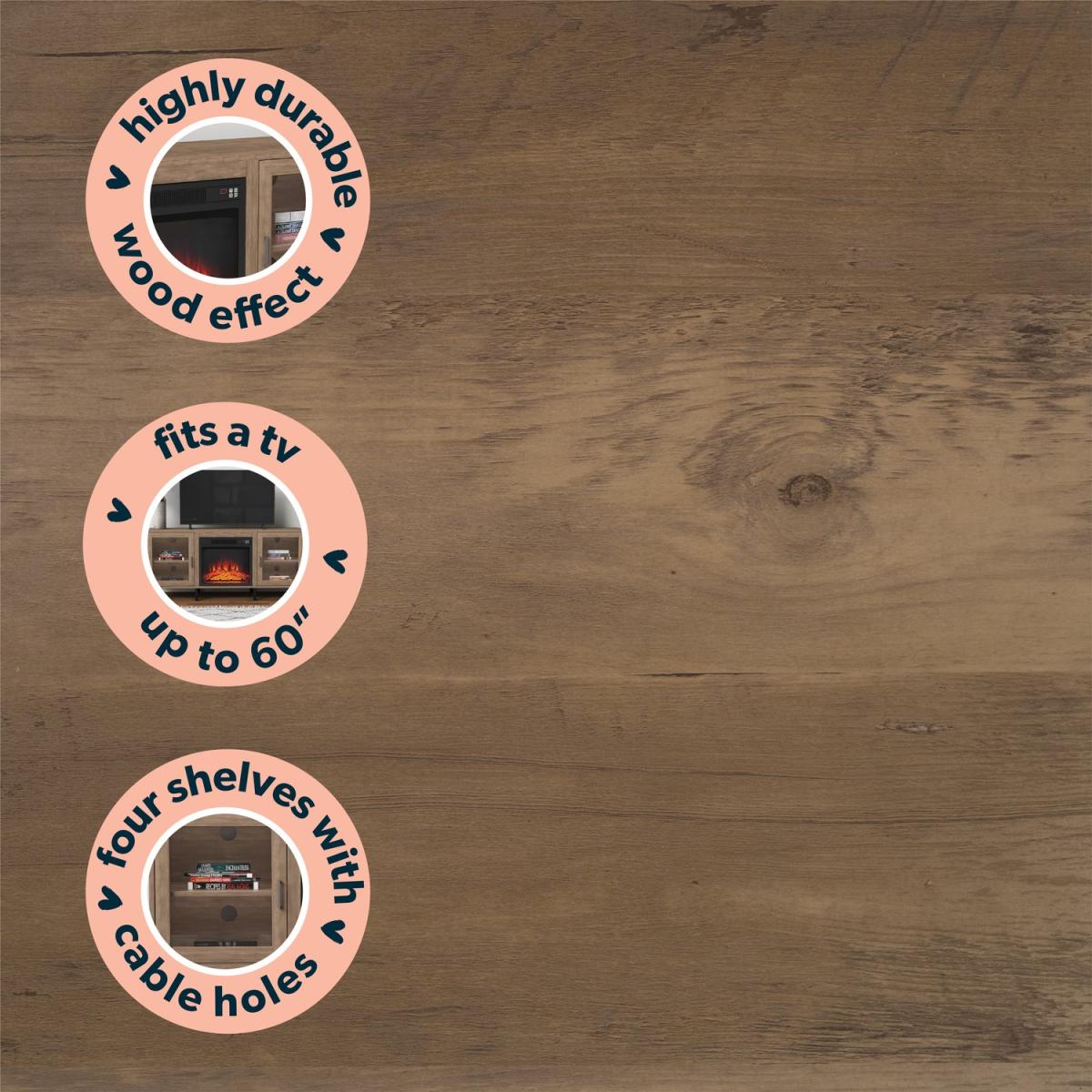 Features we love Built-in electric fireplace TV Stand and; storage in one Industrial feel with rustic wood finish and metal legs. With cable holes to house your entertainment devices. Includes a remote-control device for easy use3 energy saving LED flame effect with or without heat All about me. Enhance your living space with this industrial-inspired TV stand which includes a built-in fireplace and lots of storage space. The TV stand fits a TV up to 60” it features cabinets each with a central shelf and a closing door and the fireplace come in super handy when the temperature drops. You can use the remote control included to make changes without getting up from your sofa. And with the timer you can set your fire to turn on just in time for your arrival home. With three brightness settings on the fire you can instantly bring a warm ambience to your space. Need to know. Overall dimensions. W142.1 x H62.7 x D39 cm Overall weight. 31.6kg Number of cupboards. 2 Number of shelves. 2) Number of legs. 4 TV size. Up to 60 Door style. Hinged Fireplace temperature range. 17- 27⁰C Heat source area. Up to 400 square feet Fireplace cable length. 1.6m Colour. Rustic wood effect and black Unit finish. Laminate Unit material. MDF and metal Assembly required. Yes. Energy efficient LED technology flame and operates with or without heat Remote control with one CR2025 battery included.