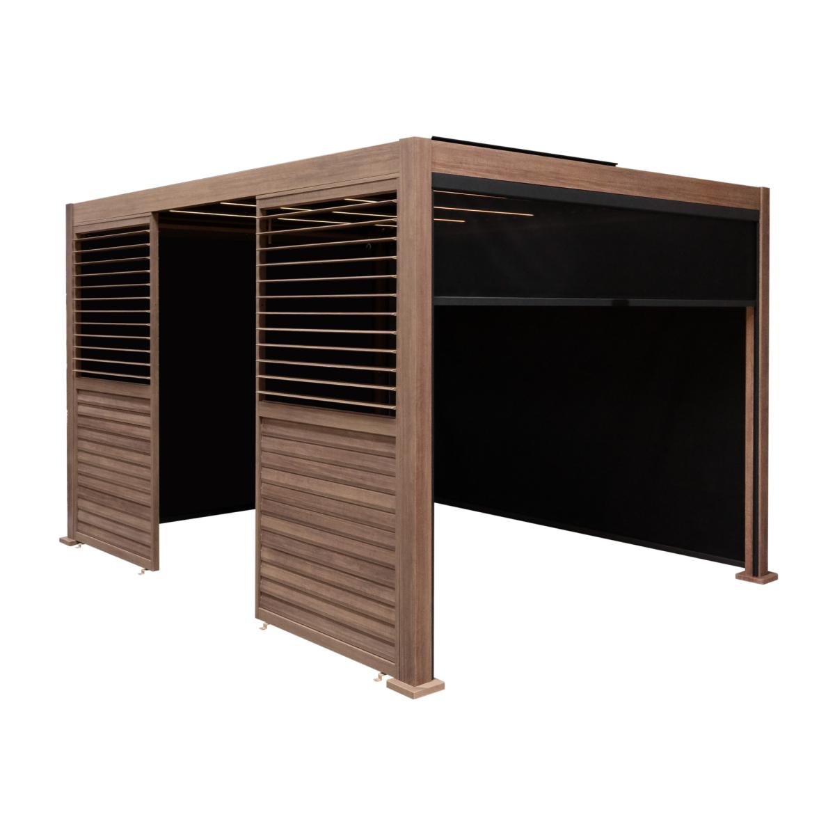 Turn your outdoor space into a sanctuary of relaxation and style with our meticulously crafted wood effect aluminium pergola. Designed to enhance any garden or outdoor area, this pergola effortlessly combines functionality with aesthetic appeal. Crafted from high-grade aluminium with a sleek powder-coated finish, our pergola ensures exceptional strength and resilience against the elements. Whether placed on your patio, garden, or backyard, its modern design adds a touch of sophistication, becoming a captivating focal point for entertaining guests or unwinding in the open air. With its adjustable louvers, our wooden effect pergola gives you full control over sunlight and shade, allowing you to customise your outdoor environment to suit your needs and preferences. Whether you desire a sun-drenched retreat or a shaded sanctuary, simply adjust the louvers with the easy-to-use manual system. Say goodbye to water pooling and unsightly runoff with our innovative built-in drainage system. Featuring U-shaped channels, our pergola seamlessly diverts water from the louvres to the frame, keeping your outdoor space dry and inviting even during rainy days. Installation is a breeze with our comprehensive assembly kit, which includes a spanner, screwdriver, and hex keys for a hassle-free setup. Plus, for added safety and stability, ground bolts are included to securely anchor your pergola to any outdoor surface.