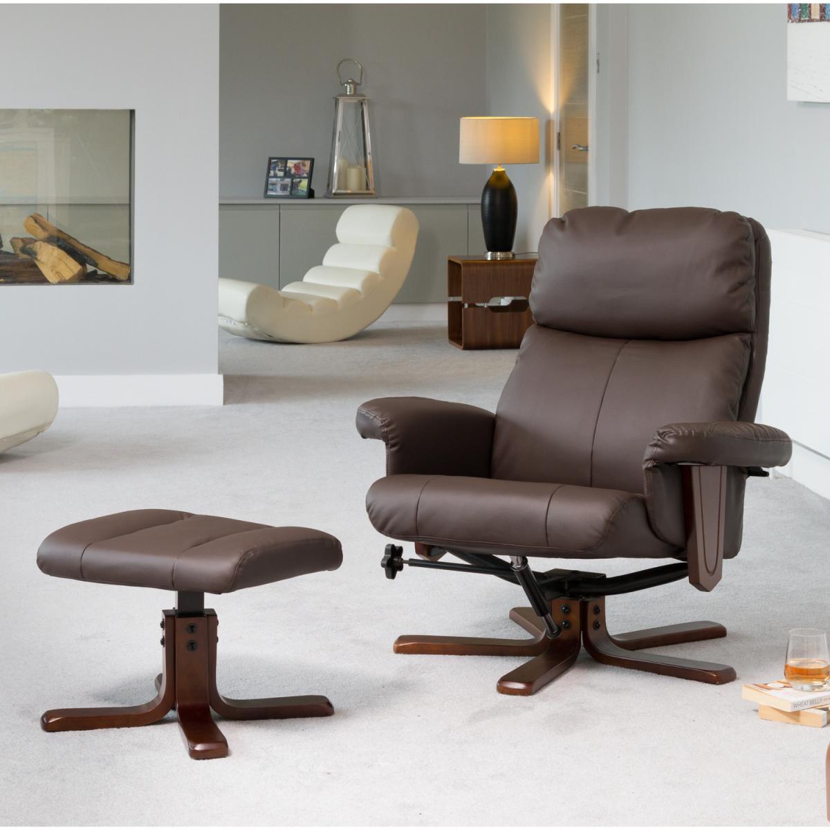 The Woodacre Swivel Recliner is a wonderfully elegant and stylish swivel-based recliner chair with a matching footstool. The chair is constructed from solid hardwood and foam covered for comfort. The chair is upholstered in bonded leather on the majority of surfaces although a faux leather match is used on the lower stress areas including, but not limited to, the back and sides of the chair. The chair has an integrated heat function in the lumbar area and massage points in the seat, lower back and headrest.