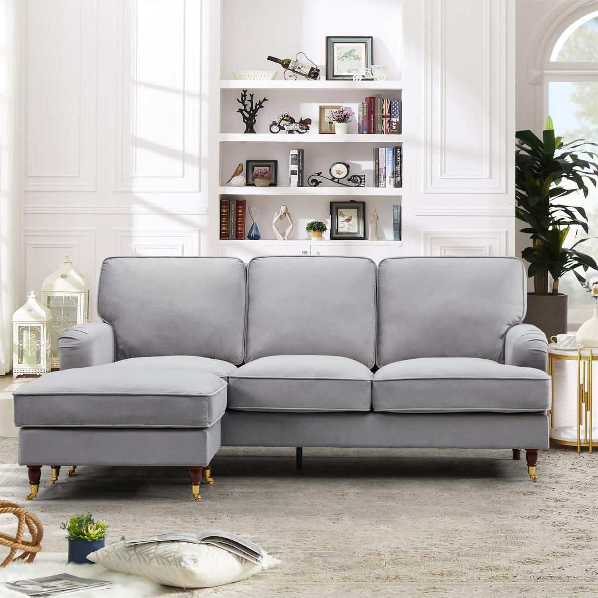 The Woodbury is a deep seated, spacious and elegant corner sofa which brightens up any room. The sofa is constructed from a solid, hard wooden frame with a pocket sprung and foam filled interior to give good balance between comfort and support. The suite is then upholstered in a soft, luxurious velvet which is complimented by a dark wooden leg, with the front legs tipped with a brass coloured wheel for easy movement. The suite is comprised of a 3 seat sofa with two detached ottoman sections to make a U-Shaped corner sofa. This model is also available as a 2 or 3 seat sofa or a reversible corner. Your order will be delivered into your room of choice and assembled by our delivery team.