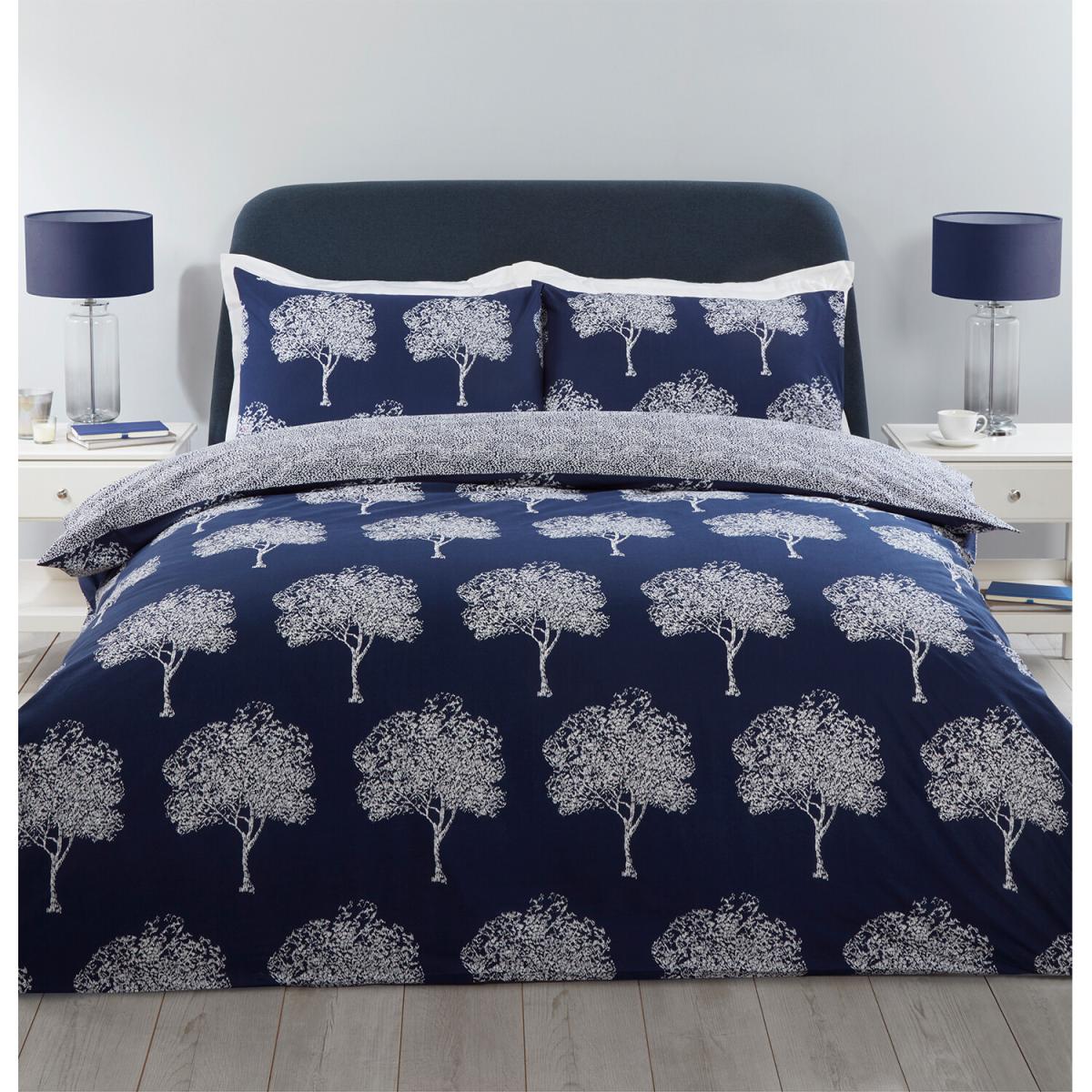 The Woodbury Duvet Cover and Pillowcase Set features an elegant and modern tree print atop 144 thread count 100% cotton fabric. This soft and stylish bedding set includes matching pillowcases and features a reverse print, giving your bedroom an inviting and serene appeal.