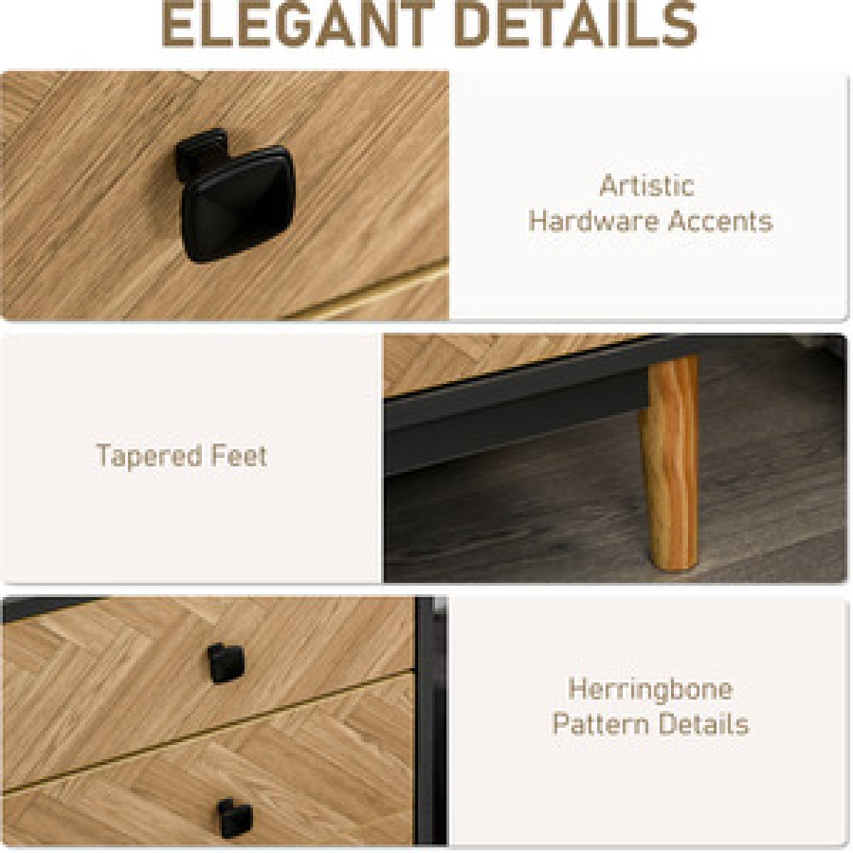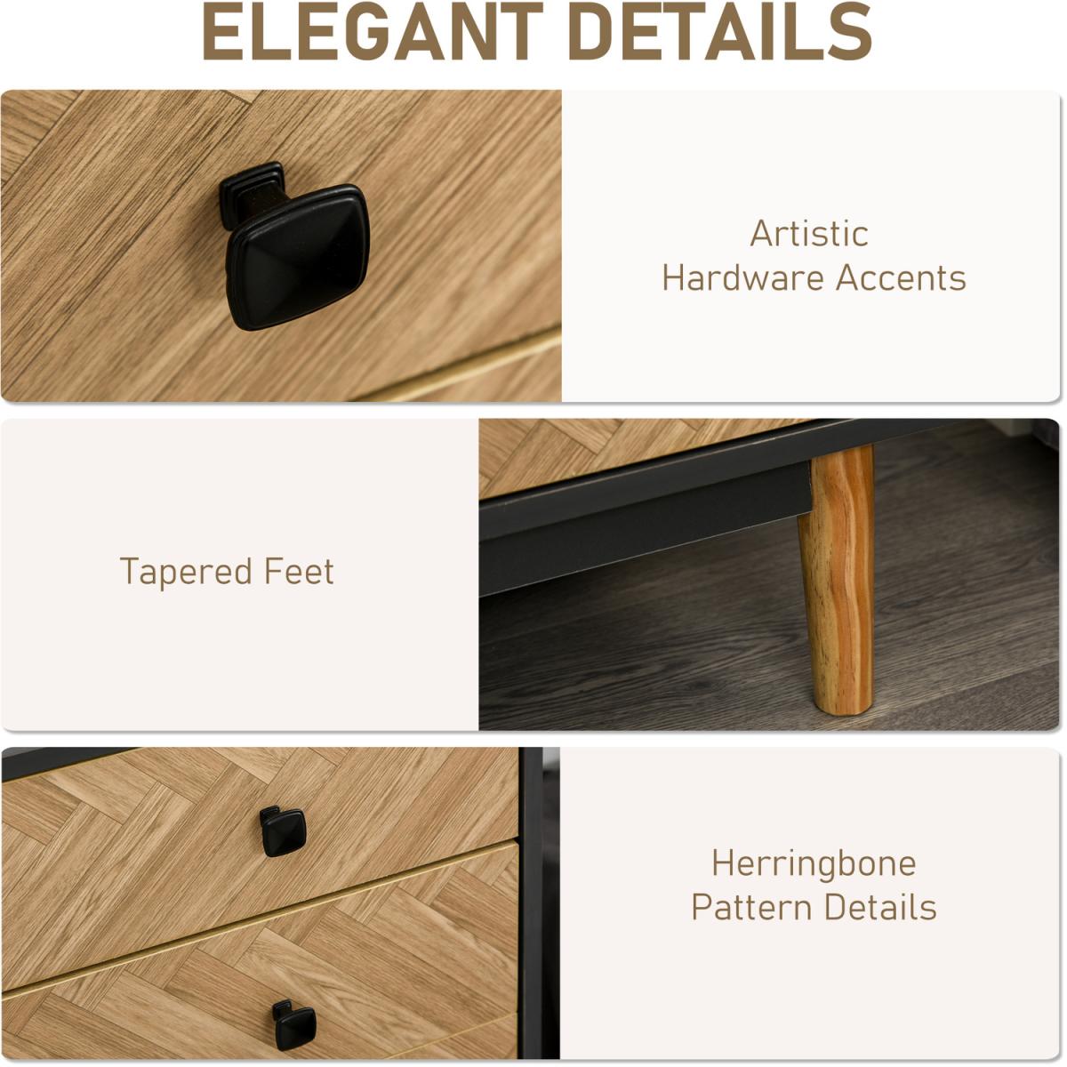 Ready to organize your home space? Pick up the drawer cabinet, and you'll be ready in no time. Bold light-dark contrast, unique herringbone pattern on five drawers, elegantly tapered feet and coordinating square hardware accents fit most modern or traditional settings. 5 easy-glide drawers provide ample space for blankets, clothing and other items. Crafted of solid E1 particleboard and pinewood legs, It is a durable and attractive addition to living or bedroom space.
