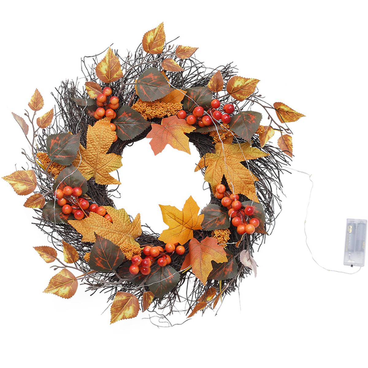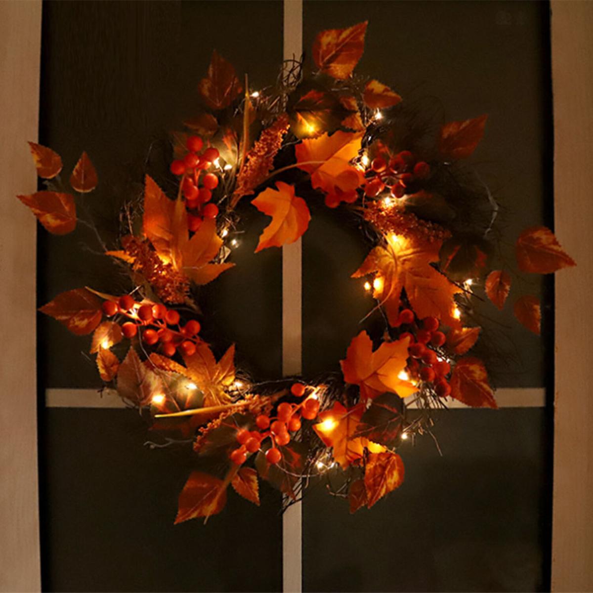 This wreath is made of faux maple leaves wreath with berries. It has a decorative appearance, so you do not need to spend time dressing it up, you can put it on the fireplace, stair railing or door frame. Surrounded by ears of wheat and rattan, which could create a romantic Christmas atmosphere. The artificial wall hanging will not wither and will stay fresh forever, and it is very easy to clean. You only need to wipe it with a towel, and it will still be beautiful after wiping (2xA. A batteries are required but not included) suitable for indoor or covered outdoor use. It could transform your bland front door into a vibrant, attractive entryway. It must be a good decoration for the Harvest, Halloween and so on.