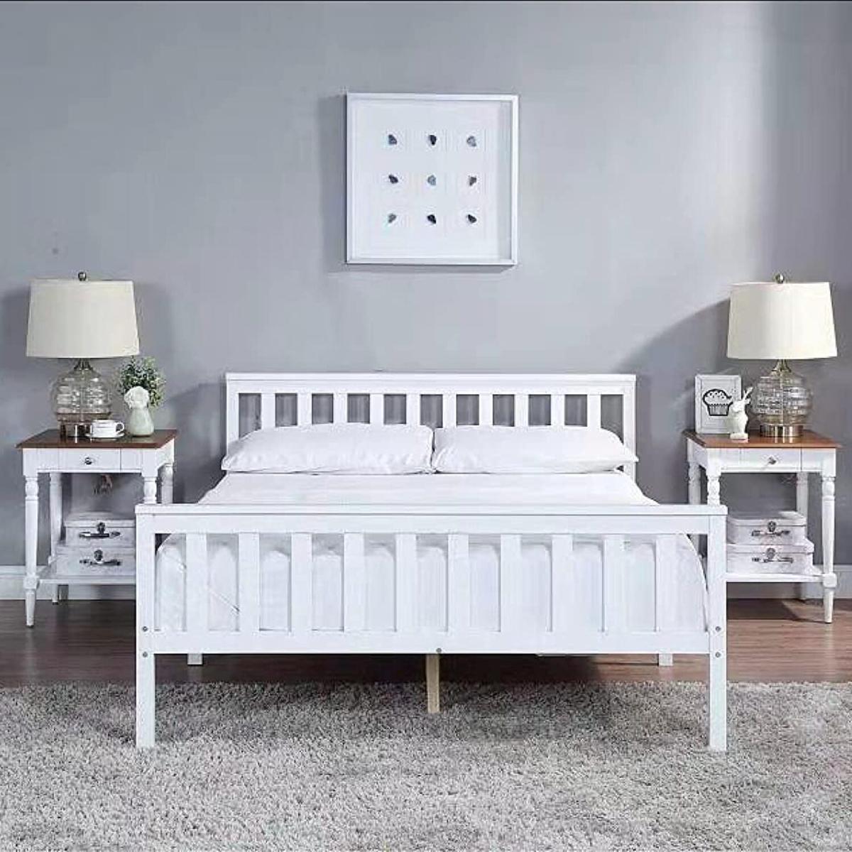 King size wooden bed frame with smooth white finish. The stylish design will compliment any bedroom interior. High quality grade A solid pine wood construction for stability and durability. Centre support beams and legs & full length slats. No noise squeak free build. 22cm floor clearance with space to store items under the bed frame. Item takes a standard 5ft King Size mattress 200cm x 150cm