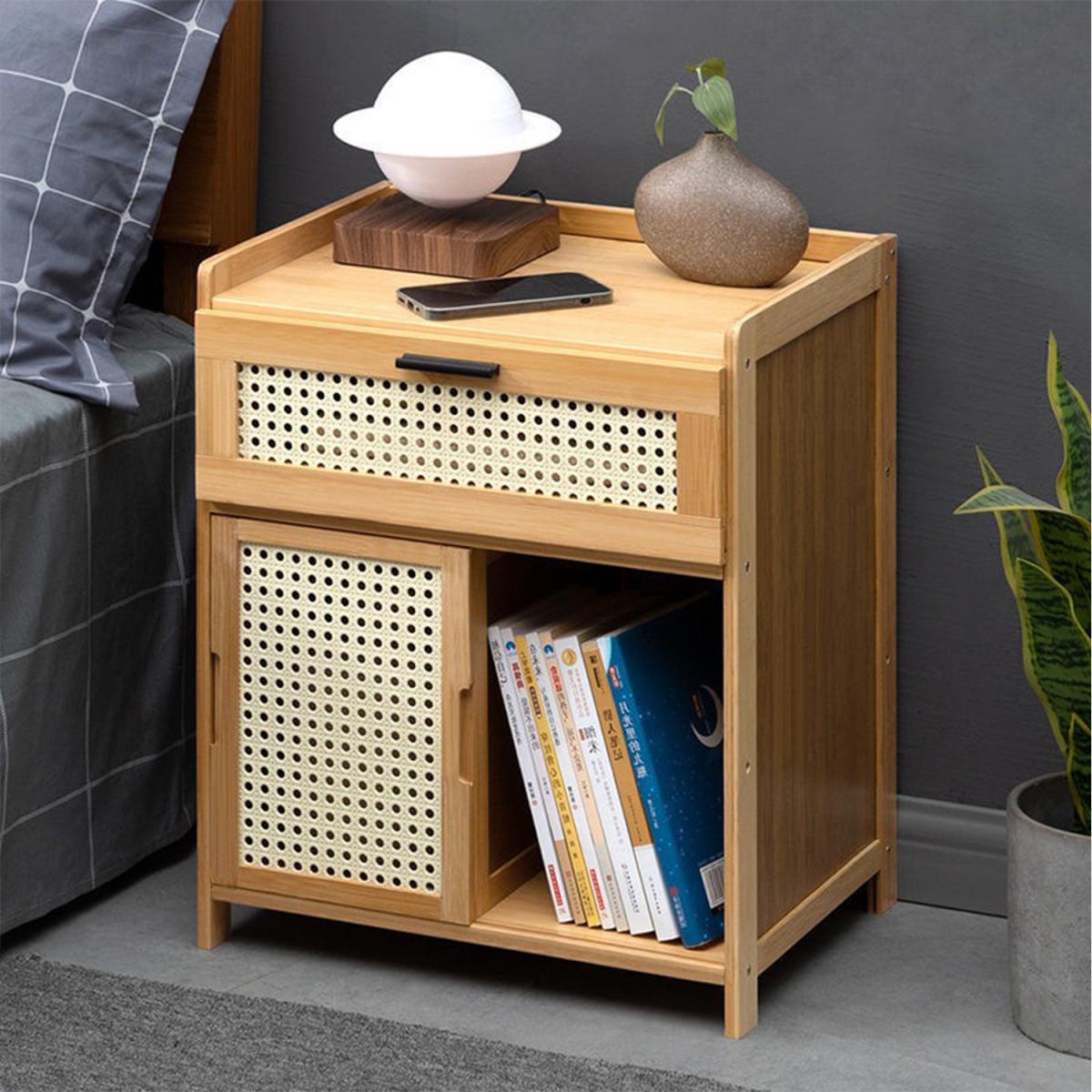 Wooden Bedside Cabinet with Sliding Doors and Double Compartments - Wood