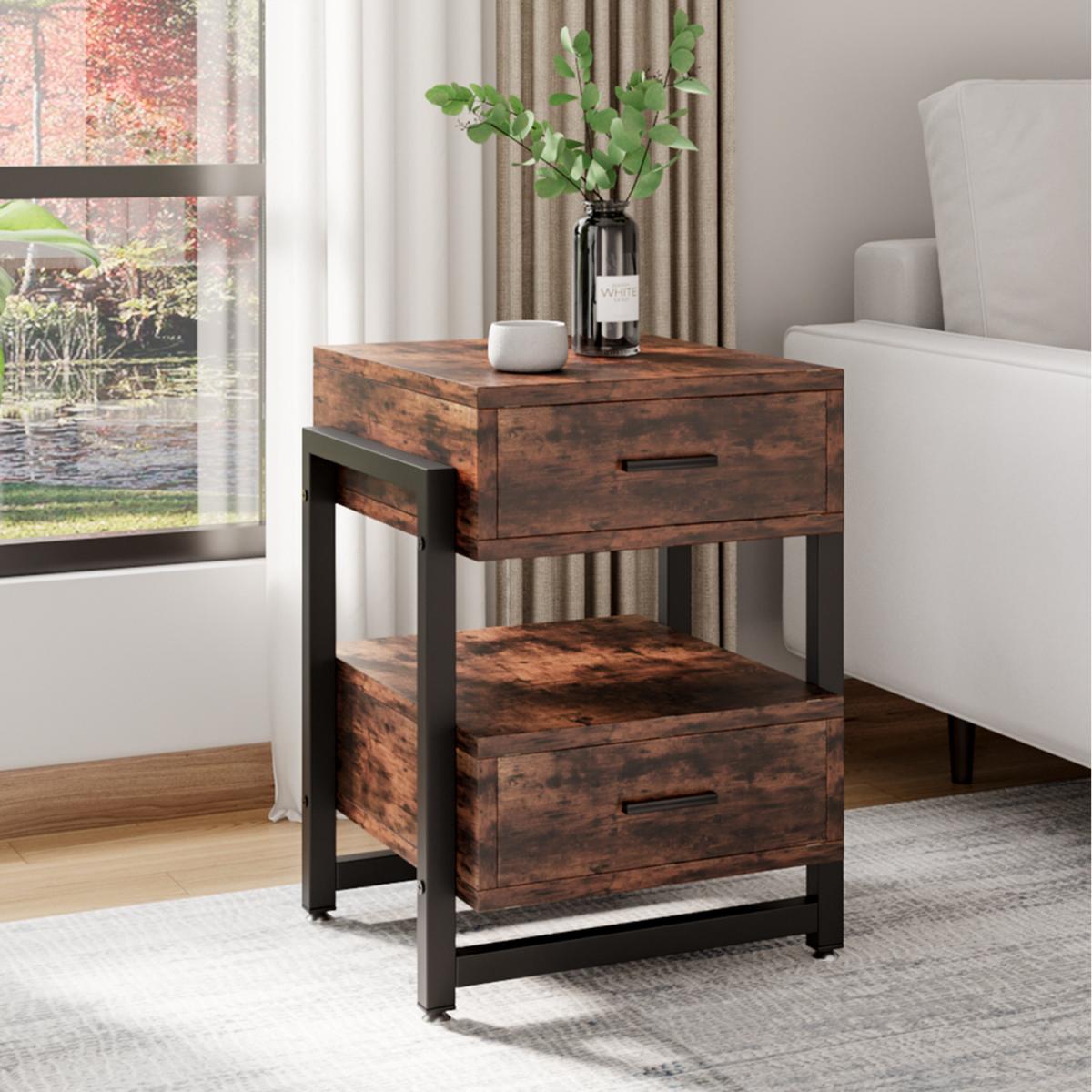 Add a touch of urban style and extra storage to your living room or bedroom with our industrial-inspired side table. Featuring two spacious drawers, this table expands your storage options, keeping your essentials within easy reach. Despite its compact design, it maximizes space efficiency, effortlessly transforming your living area into a more organized and stylish spot.