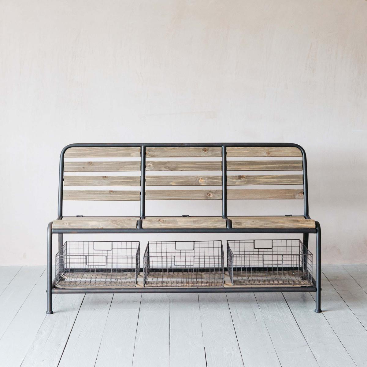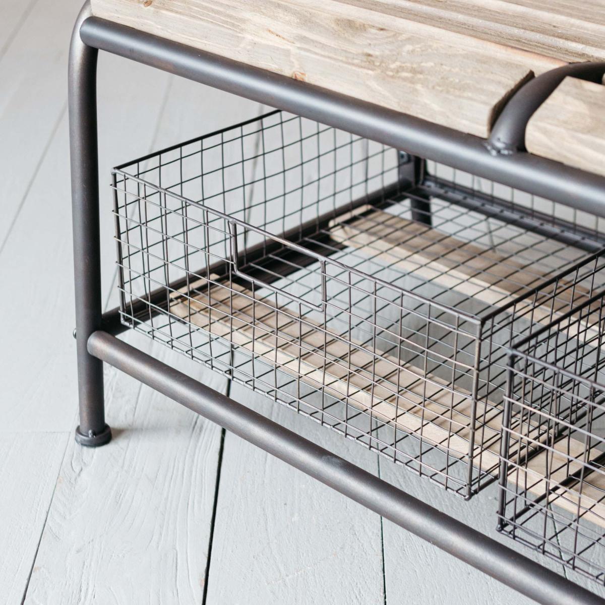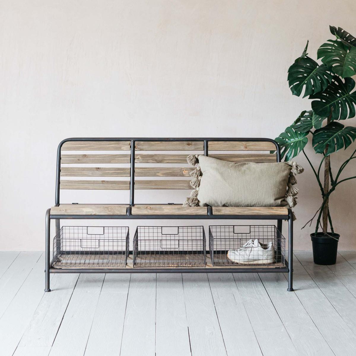 A stylish yet practical bench, featuring a slender iron frame with an industrial black finish and contrasting wooden seat and back. Complete with three wire baskets underneath, perfect for storing shoes, bags and more.