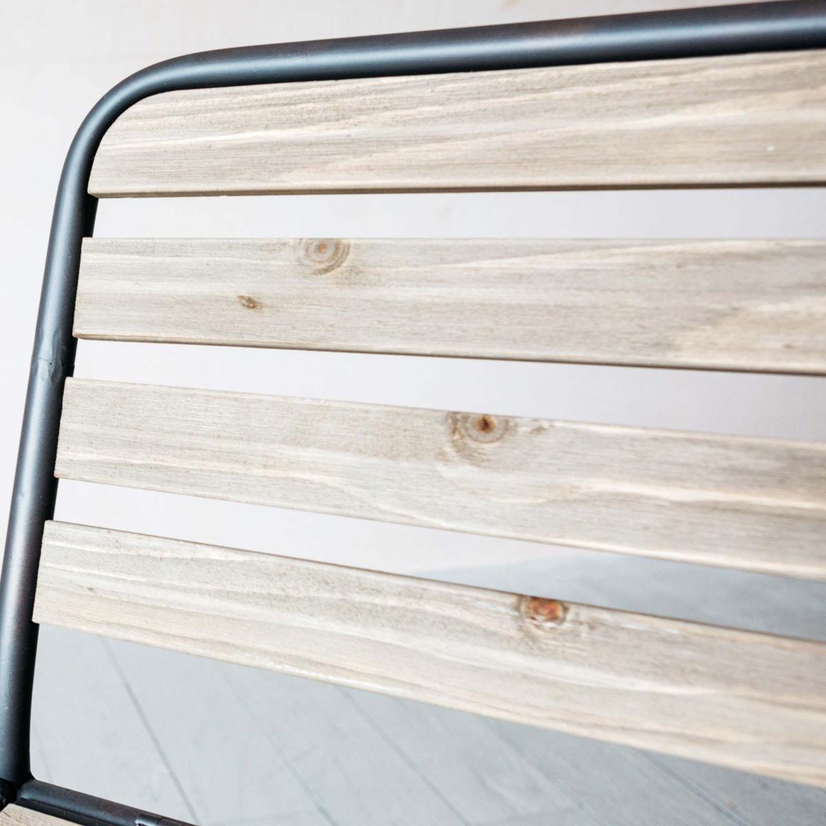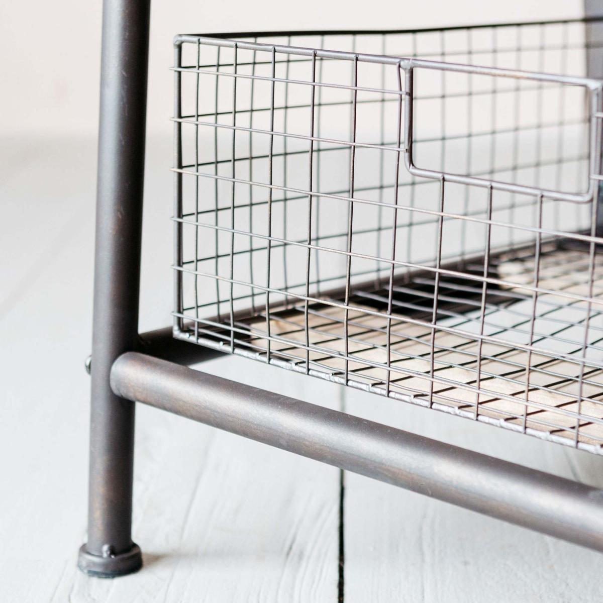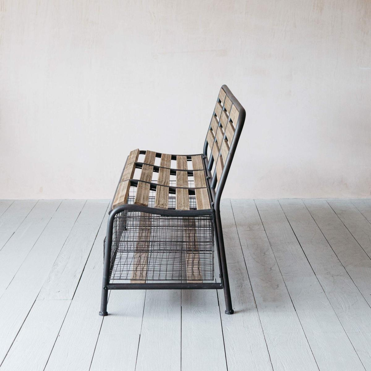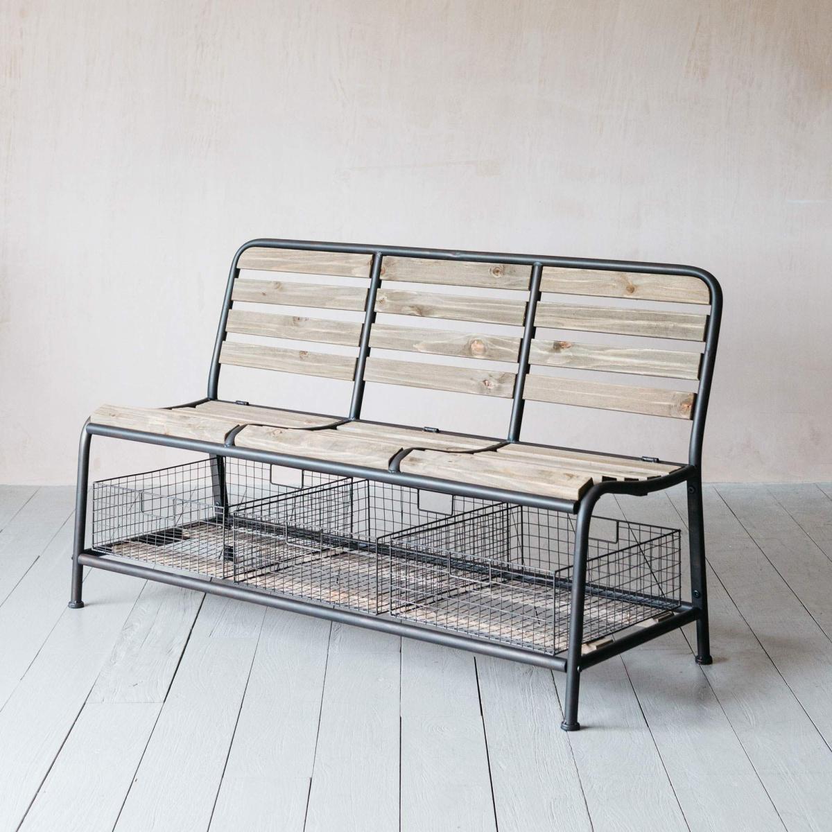 A stylish yet practical bench, featuring a slender iron frame with an industrial black finish and contrasting wooden seat and back. Complete with three wire baskets underneath, perfect for storing shoes, bags and more.