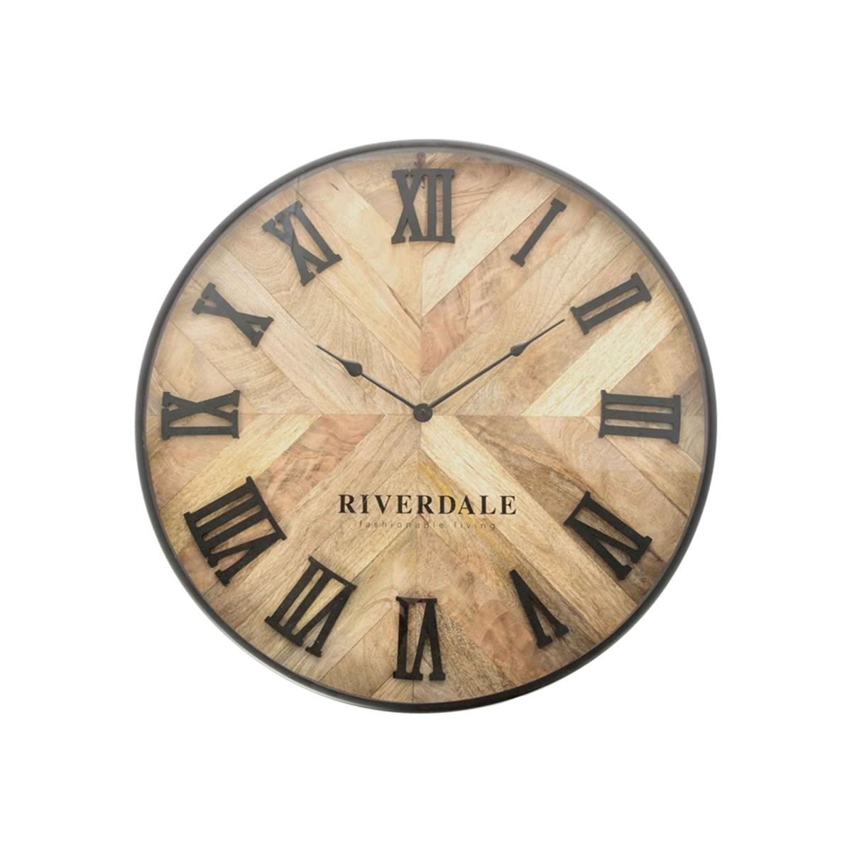 Design. Expertly crafted with a multi-tonal parquet design, the Wooden Chevron Wall Clock beautifully brings together modern and traditional styles. Black metal hands and Roman numeral markings lend a clean, classic look, making it suitable for a wide variety of interior schemes. A practical and decorative accessory, this large clock works just as well as a statement piece as it does alongside additional wall art. Natural yet contemporary.