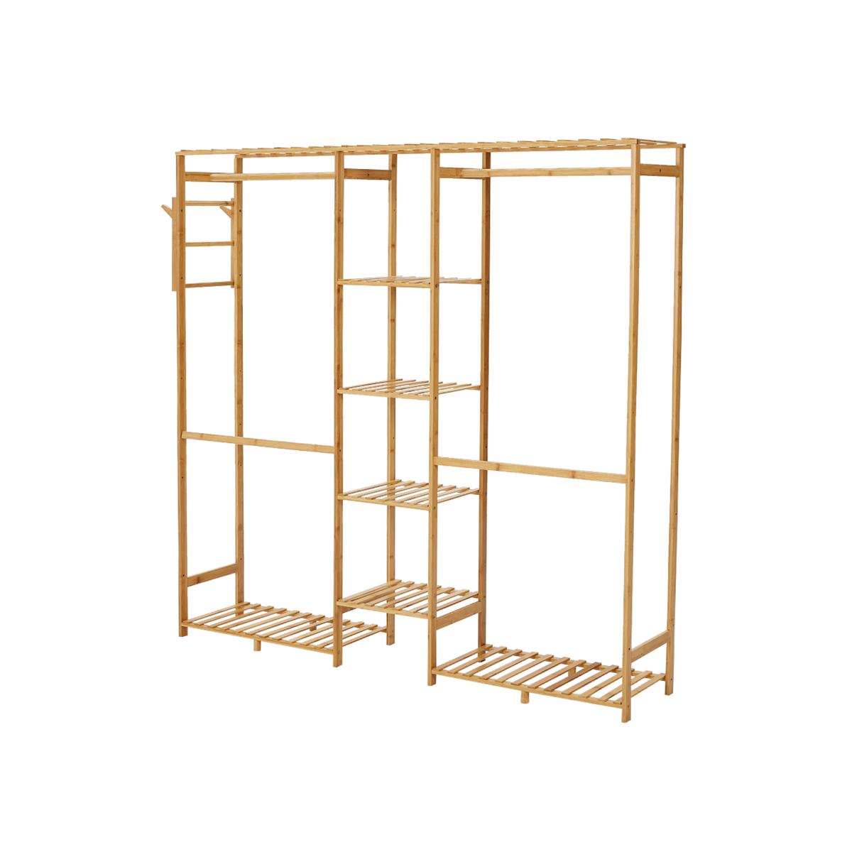 When clothes start to outnumber your storage options, this open wardrobe provides a smart and modern solution. It features four central shelves, two hanging rails, a side trouser rack and two lower shelves, giving ample space for garments, shoes, bags and other daily essentials. Made from robust and sustainable wood, it offers lasting durability and dependable use for years to come.