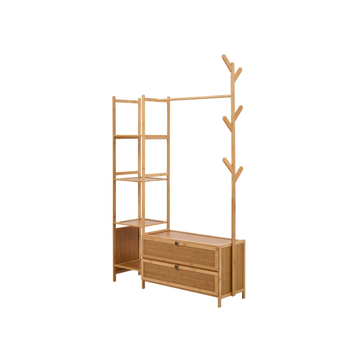 This multifunctional coat rack fits effortlessly into any interior with its minimalist natural wood look, ideal for those who value neat and efficient organisation. Designed for versatility, it offers complete storage solutions: the reinforced top rail supports heavy winter coats, while branch style hooks keep hats, bags and jackets tidy. Side shelves provide extra space for everyday items such as handbags, storage boxes and books. At the base, two dust resistant drawers offer private storage for well organised essentials. Perfect for hallways, bedrooms, balconies or living rooms.