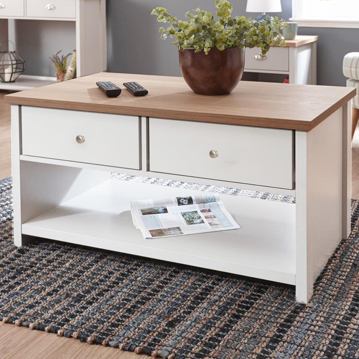 I love this wooden coffee table for its clean, versatile look and neutral cream finish, which makes it easy to incorporate into a variety of interiors. It's particularly well-suited to contemporary, Scandi, or coastal styles, where its light tone brightens up the space. Practical styling tips include using it as a functional focal point-layering candles, books, or a tray to keep essentials organised-and pairing it with soft textiles and natural materials to create a warm, inviting lounge. Its drawers are handy for keeping clutter out of sight, while the open shelf provides space for magazines or decorative accessories, making it both attractive and highly functional.