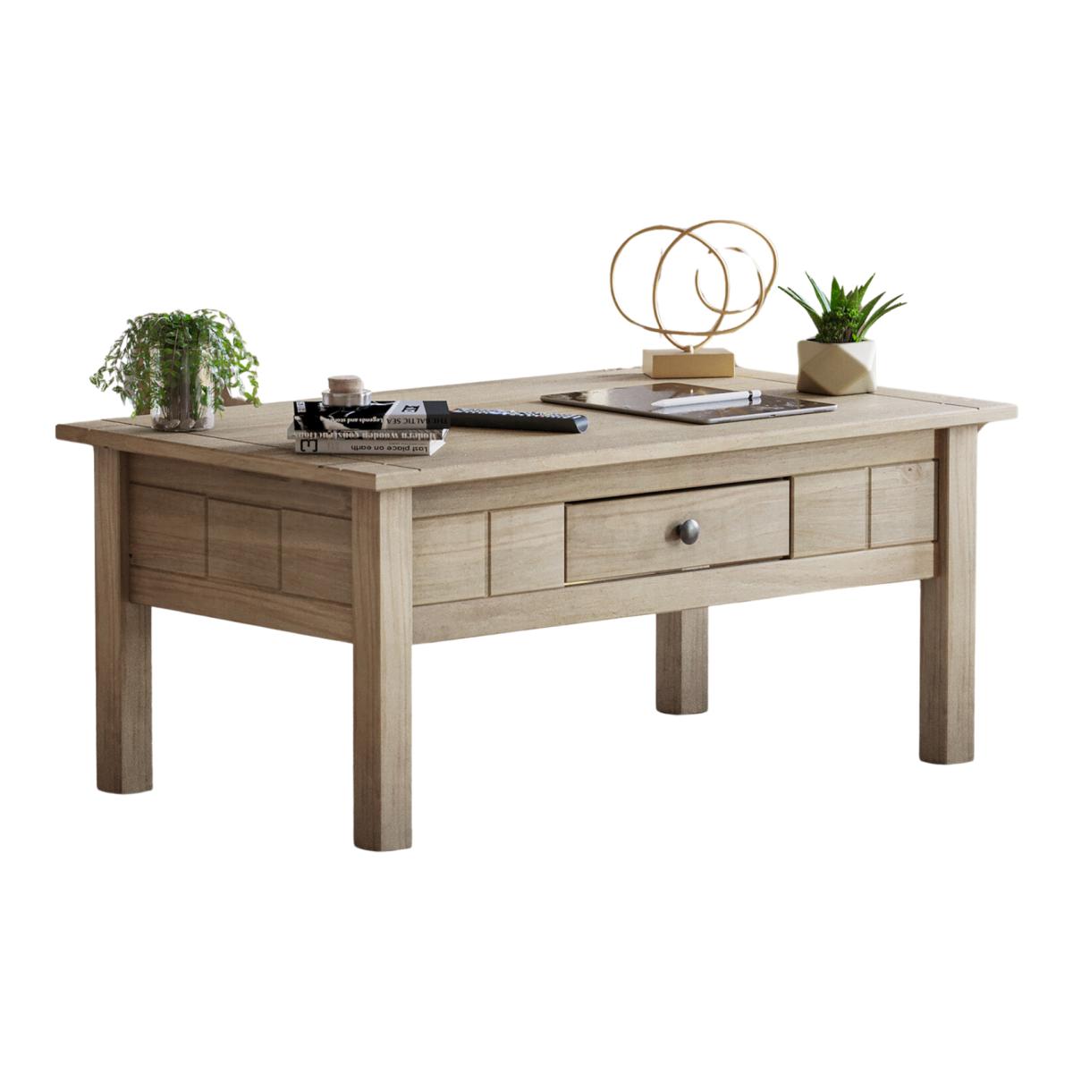 The versatile coffee table brings an old-country feel to any room with its solid pine construction and hand-waxed antique finish, highlighting the natural grain for a distressed, rustic look. Featuring two drawers on wooden runners and a hardboard drawer base, this coffee table provides practical storage space, with black metal handles and decorative studs adding distinctive style. The Corona range blends classic design with a modern twist, making it a perfect fit for a variety of interior styles, from rustic to contemporary. Built from solid pine, this coffee table is designed to last, with a sturdy frame that withstands everyday use while enhancing the beauty of your living space.