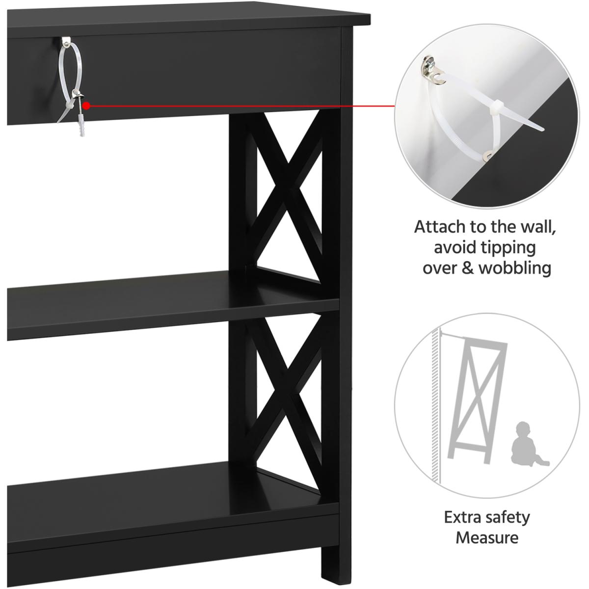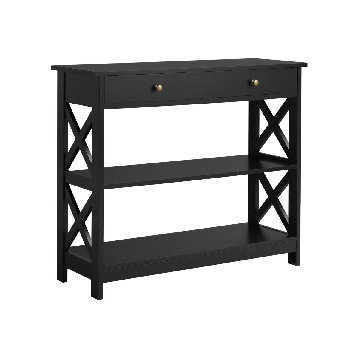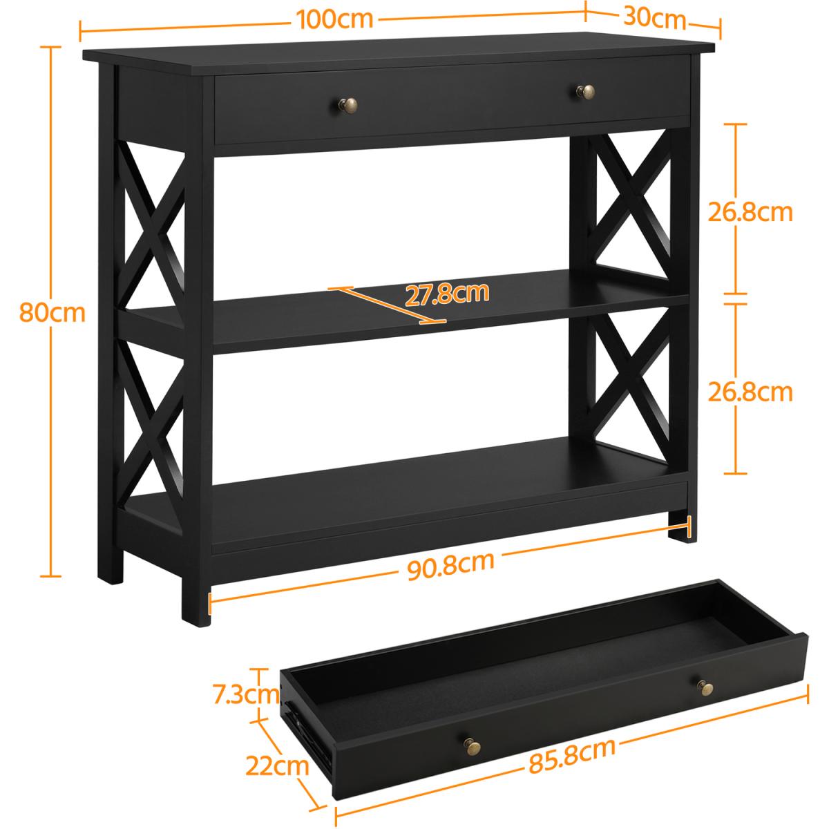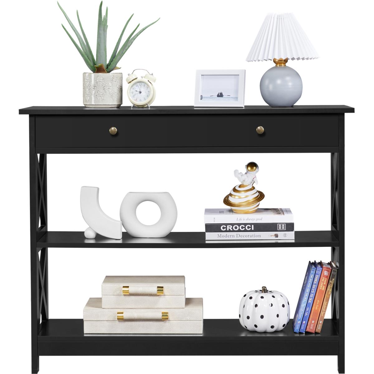 Looking for a practical while tasteful console table Try this minimal one with a big drawer and 2-layer shelves. Boasting CARB P2 MDF board and pinewood legs covered by water-resistant veneer, this 3-tier console table is stable, safe and easy to maintain. It is designed into a 3-layer structure with 2 open shelves and 1 big drawer, allowing you to accommodate some frequently used items or decorations on it. This 3-tier console table features a minimal and chic style that can harmoniously fit various home or commercial decors. Best of all, it is a budget model that aims to have all your concerns covered.