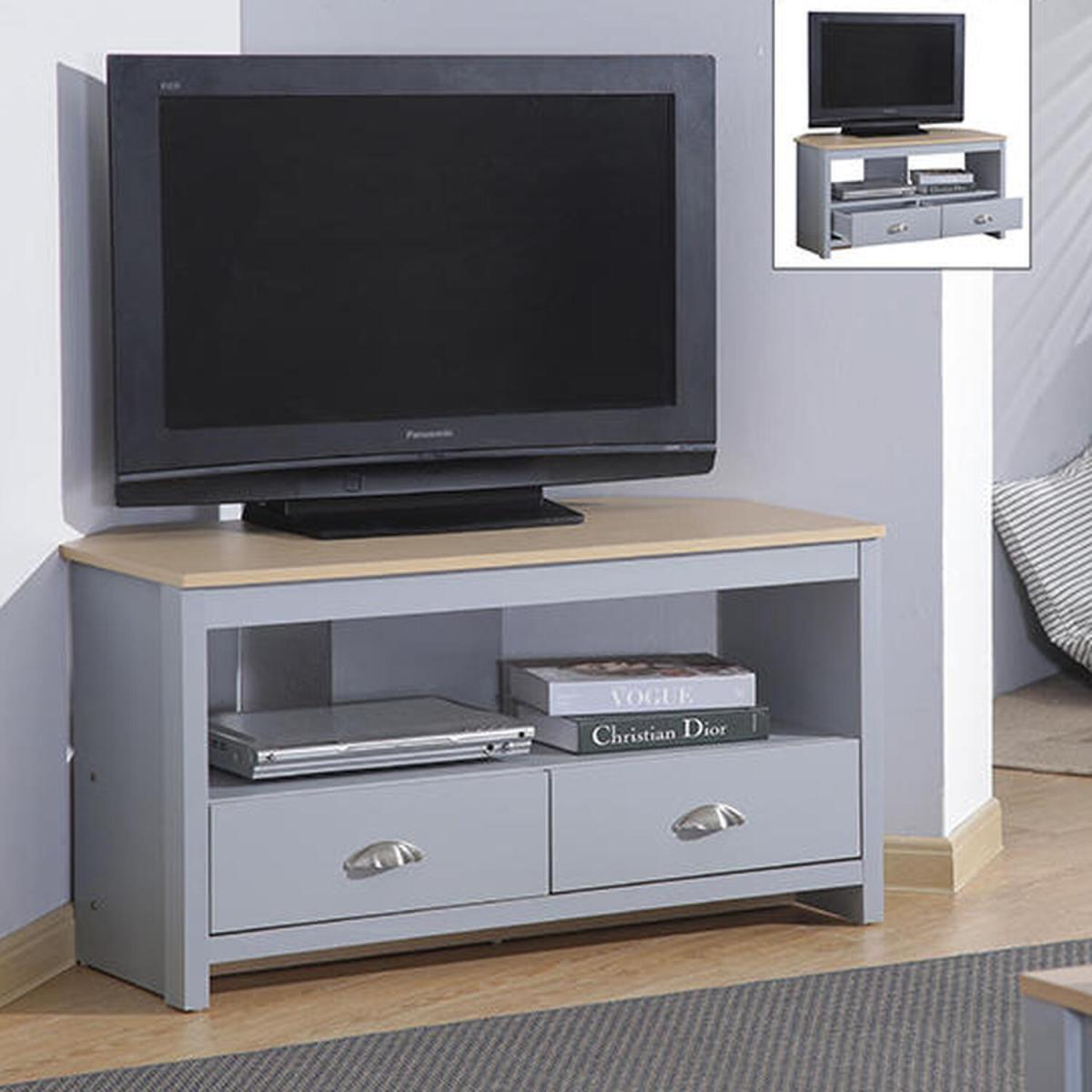 This modern stylish corner TV unit is available in a soft grey or white finish with a contrasting oak effect top. The TV unit provides space for your home entertainment equipment, and 2 drawers for extra storage space. Ideal for a room where understated elegance is the goal.