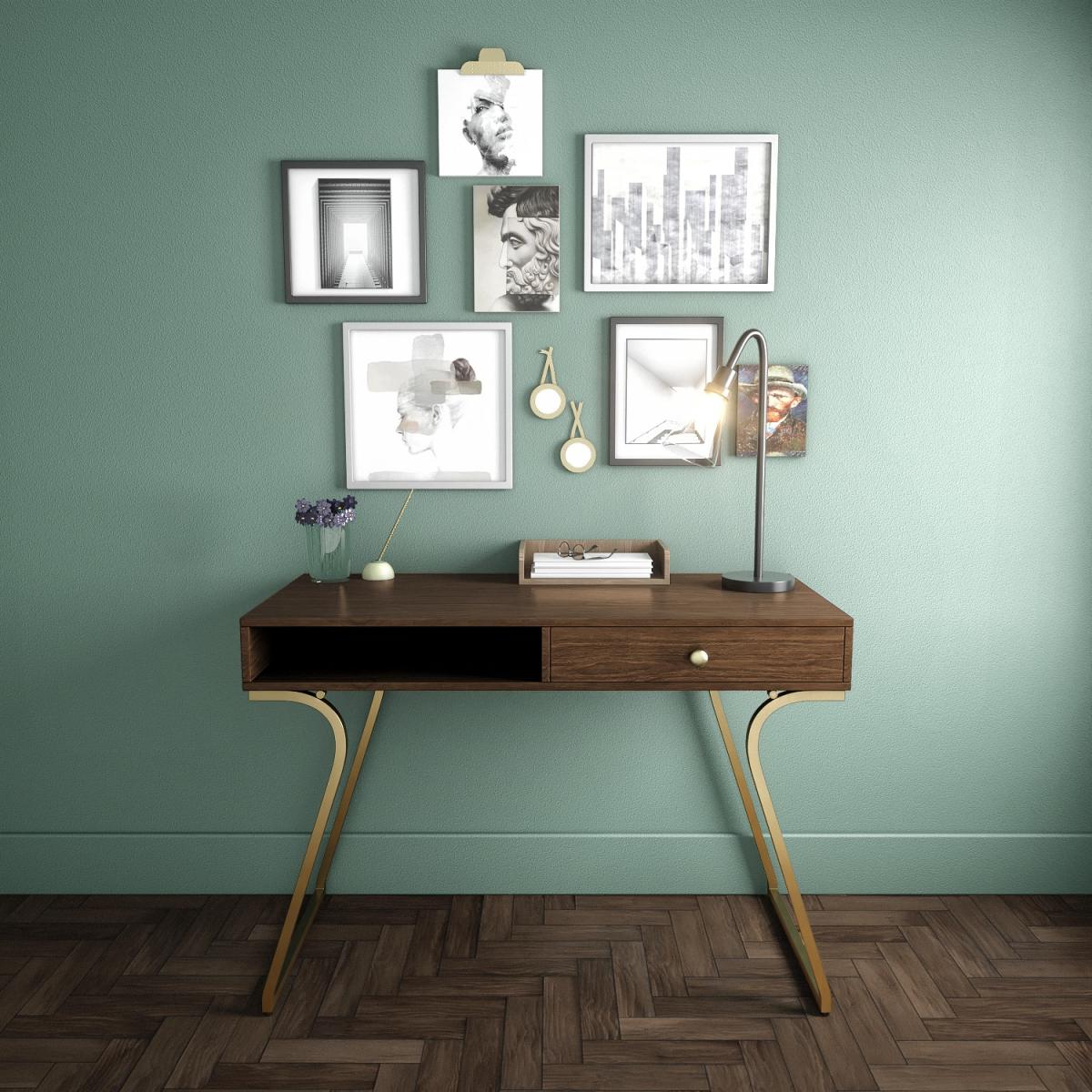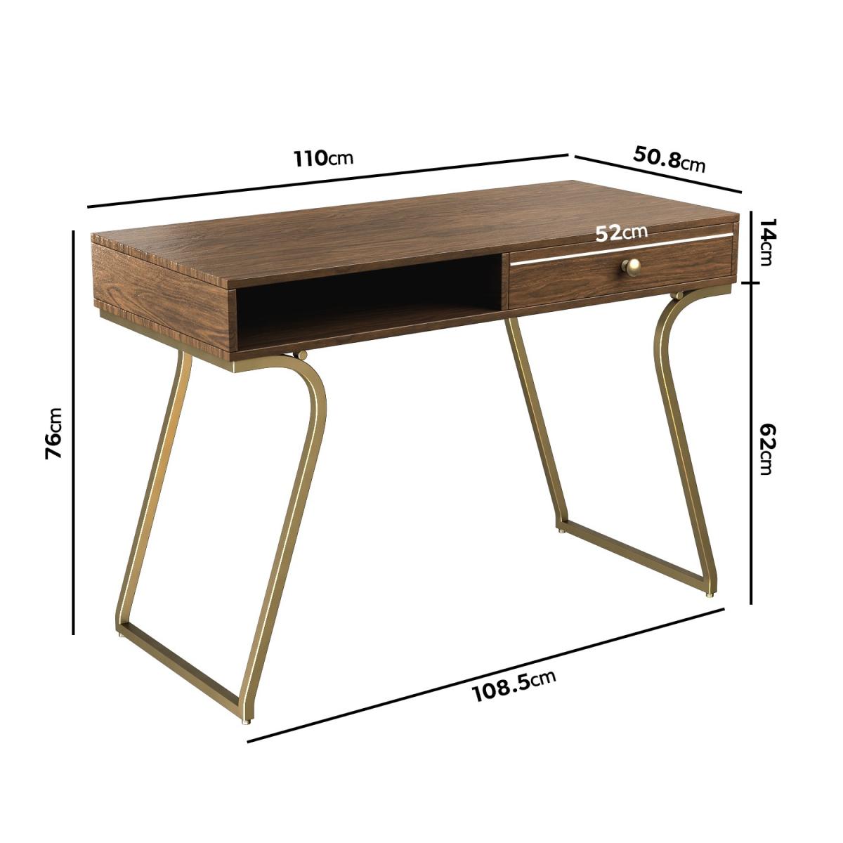 Mid-century style desk perfect for the home office Finished in a beautiful walnut-coloured acacia wood Curved gold legs create a stylish statement silhouette Spacious storage with handy drawer and inset shelf Single drawer is constructed with a wooden runner Easy to assemble Need to know Weight: 24kg Leg Height: 62.8cm Colour: Brown and gold Material: Acacia wood and metal Finish: Lacquered Leg finish: Powder-coated metal Assembly required: Yes