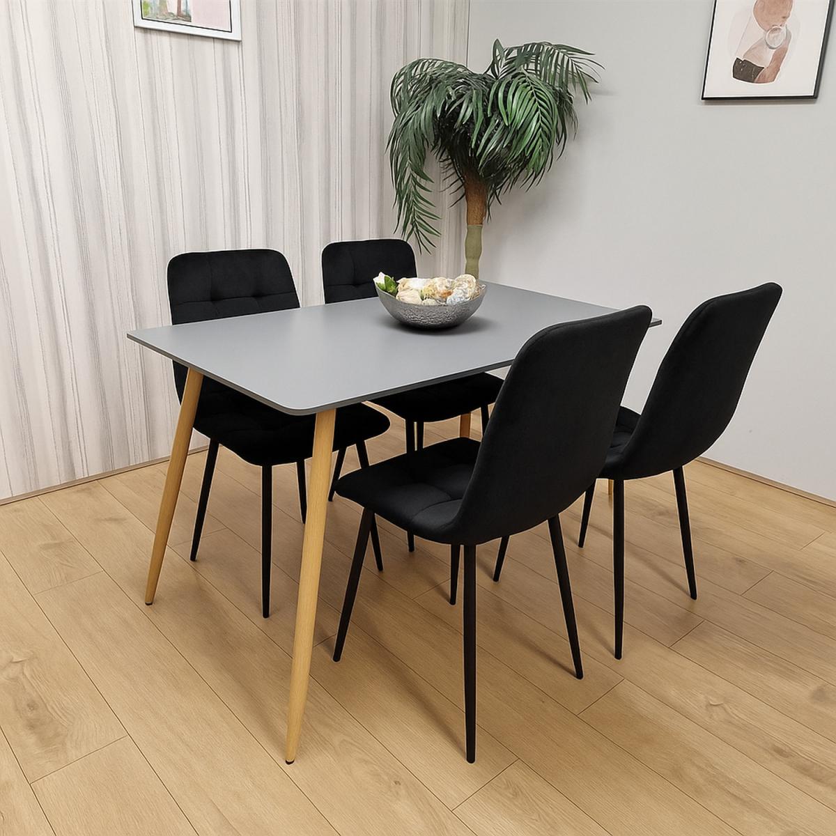 A stunning wooden grey finish Dining Table set includes Set of 4 Black Tufted Velvet Chairs with slightly curved back design fits body shape The dining table colour is grey with metal legs that showcase an oak-effect finish. The dining chairs colours are Black with armless design padded seat and back for the comfort The dinner table is crafted with high-quality MDF, and a melamine laminated finish to ensure a durable, long-lasting tabletop. The dining chairs are made of top quality soft velvet with metal legs Dimension:The dining room chairs sizes are H87 cm x L59 cm x W44 cm. Dining table size is H75 x L120 x W70 cm. The seat height of the chair is 45 cm Straightforward assembly, supported by clear instructions for a hassle-free setup