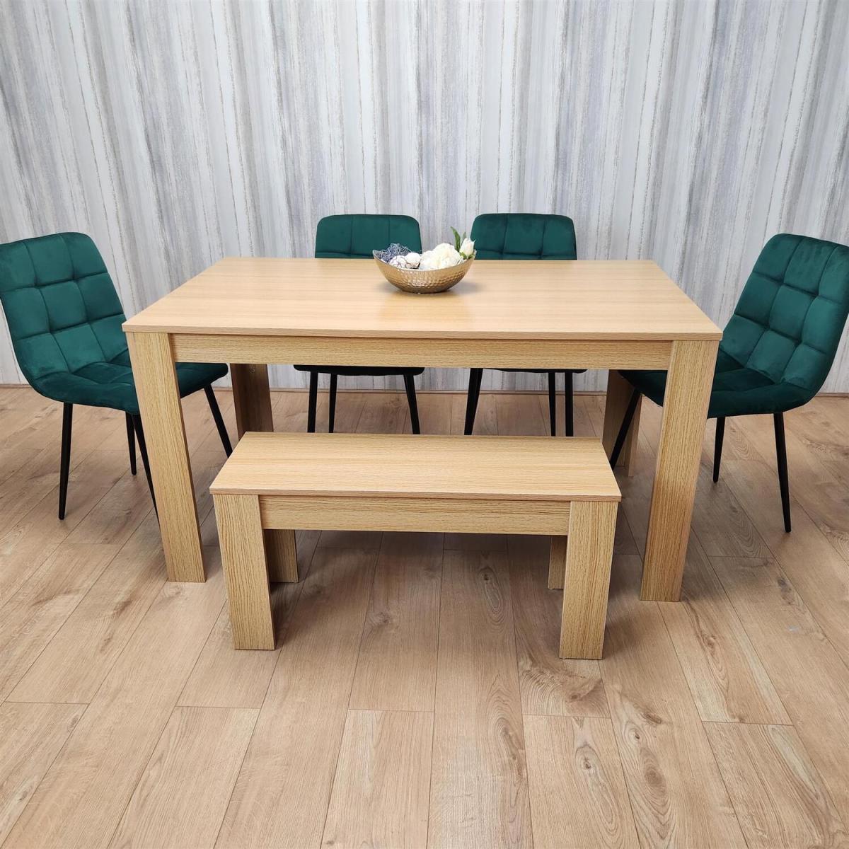 A Stunning wooden beige oak effect Dining Table set included set of 4 tufted velvet green rocco chairs with slightly curved back design, and 1 Bench. The dining table colour is beige with oak effect. The dining chairs colour is green with slightly curved back design for fitting with body shape. The dinner table is crafted with high-quality MDF, and a melamine laminated Light Oak natural wood grain finish to ensure a durable, long-lasting tabletop. The dining chairs are made of premium velvet with metal chair legs. Dimensions The dining room chairs sizes are H87 x L59 x W44 cm. Dining table size is H75 x L140 x W80 cm. The seat height of the chair is 45 cm Bench made of high quality MDF and matching oak effect with a size of L90 x W30 x H45 cm. Straightforward assembly is supported by clear instructions for our dining table set. FEATURES The Dining set includes a table, 4 high-quality chairs, and 1 Bench. Dining table made of high-quality MDF and a melamine laminated Light Oak natural wood grain finish. Chairs material is premium velvet with metal chair legs. Legs prevent damage with the adjustable foot protection provided. Chair Size H87 x L59 x W44 cm. Table Size H75 x L140 x W80 cm. The seat height of these chairs is 45 cm. Convenient format with instructions for easy assembly.