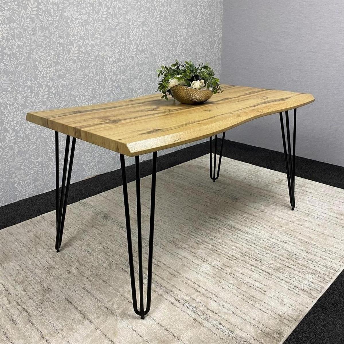 This beautiful set features a live edge wooden dining table paired with four elegant white faux leather gem patterned chairs, creating a stylish and inviting centrepiece for any home. The table is crafted with a curved live edge engineered wood top that highlights the natural wood texture, supported by sleek black metal hairpin legs for a minimalist and sturdy design. The chairs are upholstered in premium faux leather with diamond stitching on both the front and back, offering a blend of elegance, durability, and comfort. Perfect for dining rooms, kitchens, cafes, or restaurants, this set combines timeless design with everyday practicality. Dimensions Table L117 W77 H75 cm Chair H85 L52 W44 cm Seat height 44 cm