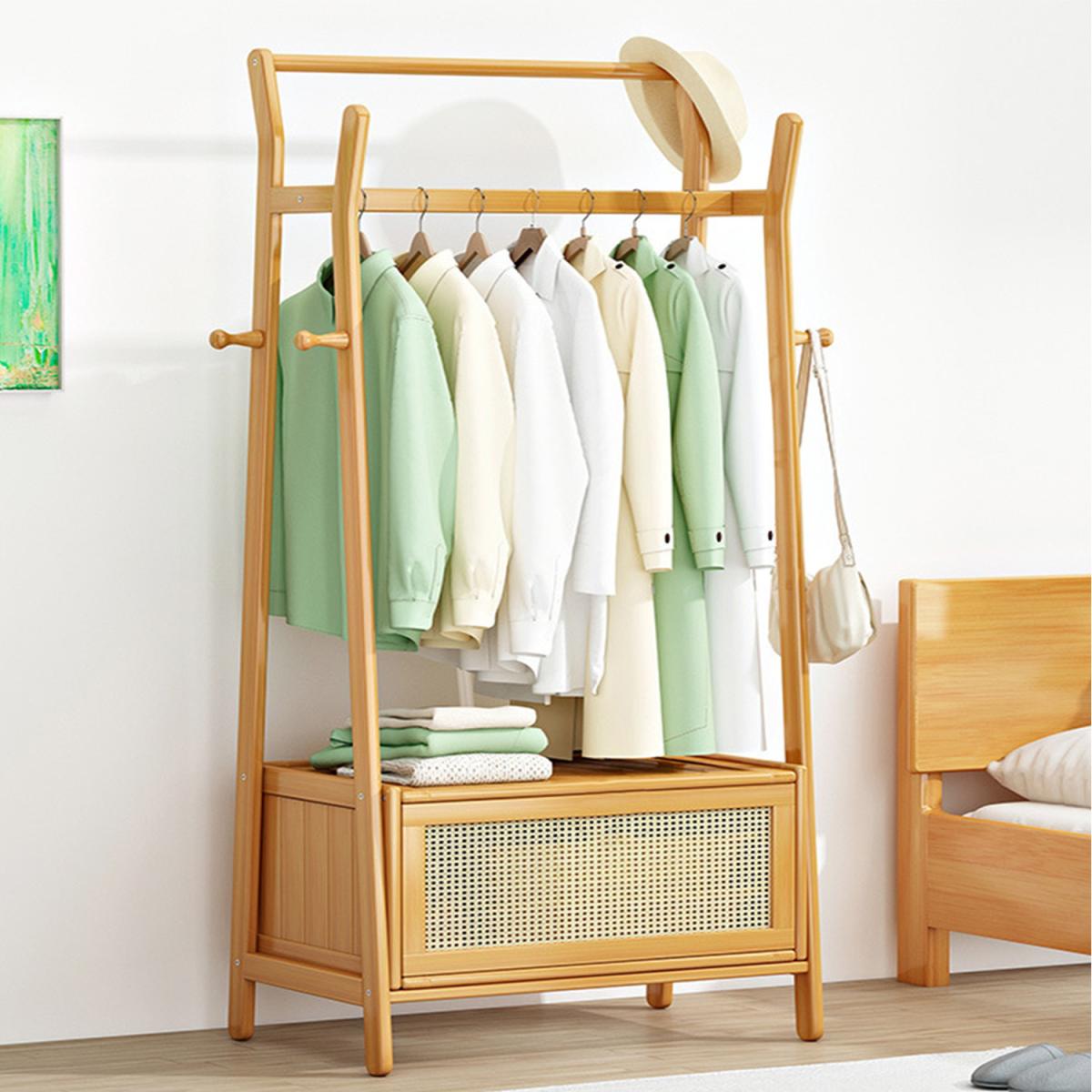 This coat rack offers convenient hanging space, making it easy to select and retrieve clothing. It includes a breathable storage box, ideal for organizing items by season or frequency of use, or for storing quilts, blankets, and more. Positioned at the base, the box not only provides extra storage but also adds stability to the structure. With two hanging rods at different heights, you can hang clothes by length, keeping everything tidy and organized. Its simple design and clean lines create an elegant, understated look, bringing order and style to your home.
