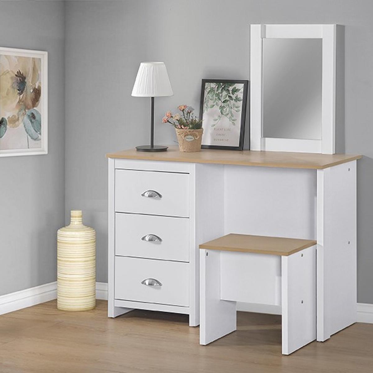 I really like this wooden dressing table set because of its versatile and timeless white finish, which works well in both modern and more traditional interiors. The natural wooden top adds warmth and texture, preventing it from feeling too clinical. It’s ideal for bedrooms where you want a functional yet stylish focal point. For styling, consider adding a few organised storage trays for jewellery and makeup, and keep the mirror clean for a sleek look. It pairs nicely with soft colour palettes or accent tones like pastels or earthy shades to create a balanced, inviting space. This set also suits compact bedrooms thanks to its smart layout, maximising storage without overwhelming the room.