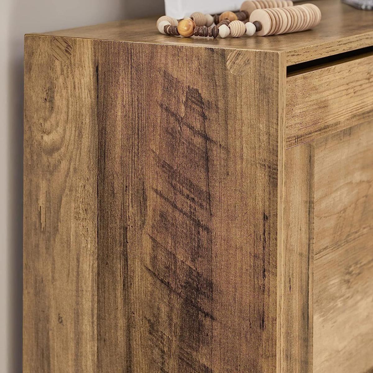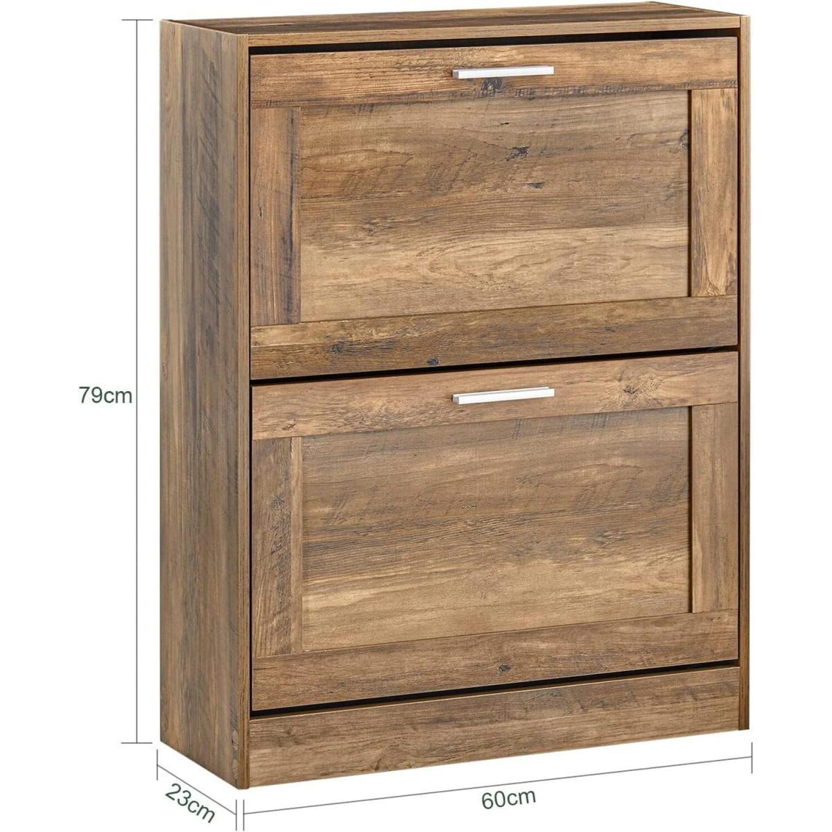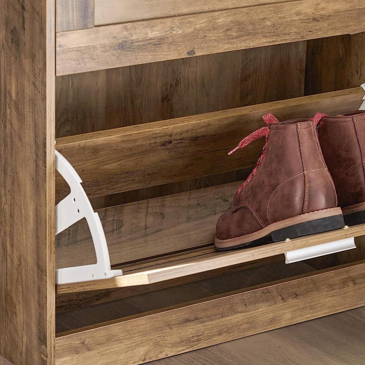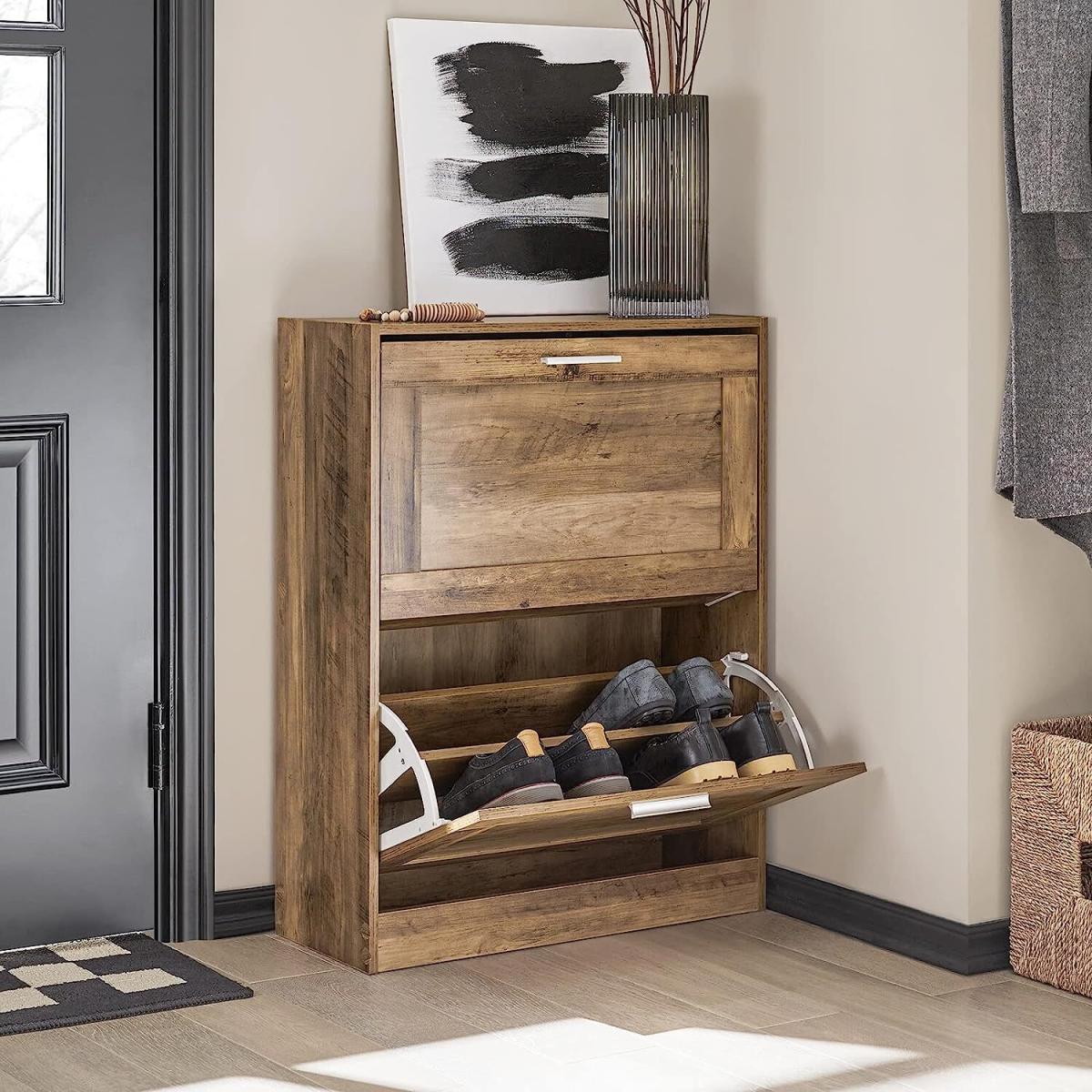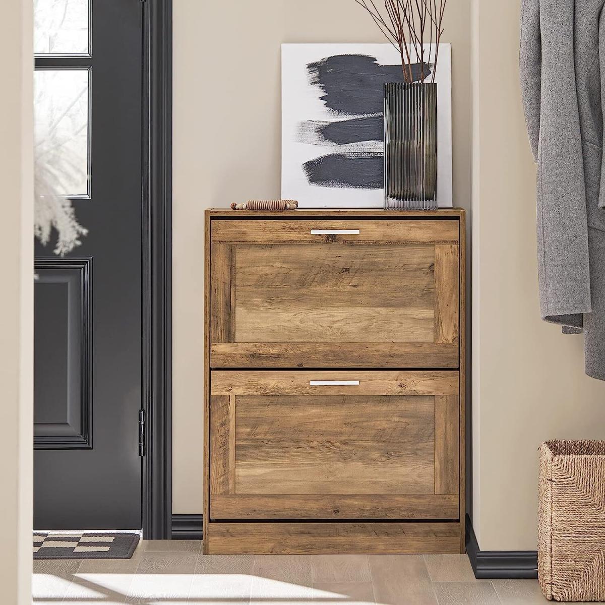 Modern design 2 drawers shoe cabinet is a great addition to your home. Ideally located in hallway or porch, this unit comes with plenty of storage. It provides a shoe storage compartment of 2 flip-drawers.2 rows of spaces for each drawer. The panel in the flip-drawer is removable, so you can put it on or remove it due to different sizes shoes. The top of the shoe cabinet is ideal for storing something like keys, wallet you might need in reach, or some items like photos, plants you want to display. Coming with anti-tipping device, ensuring great stability and safety. The 23cm deep shoe cabinet is ideal for a narrow corridor. This shoe rack will keep your halls and entryway organized.