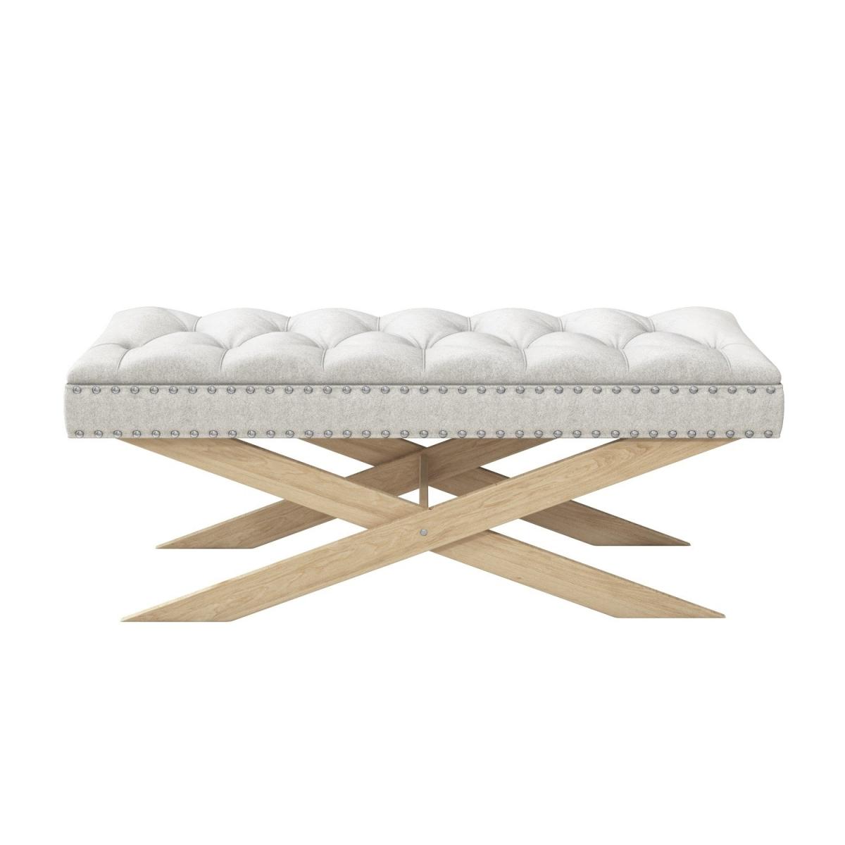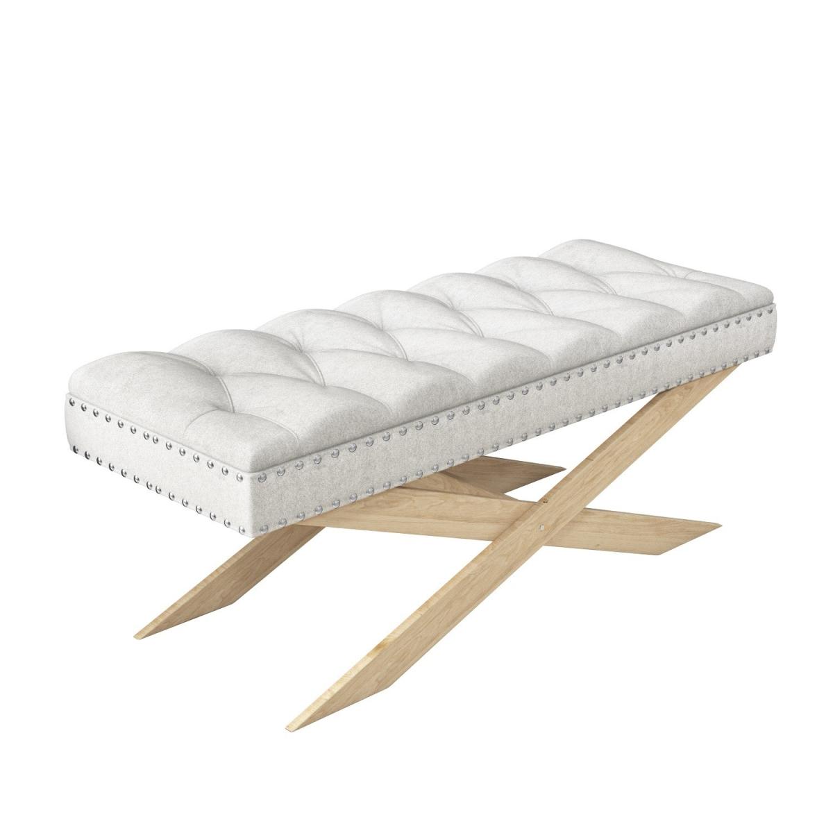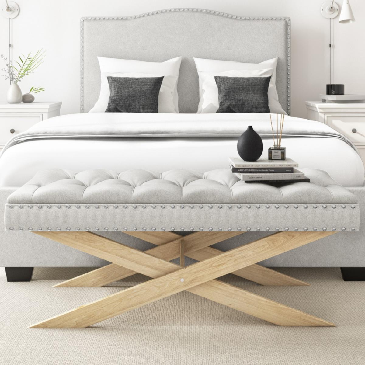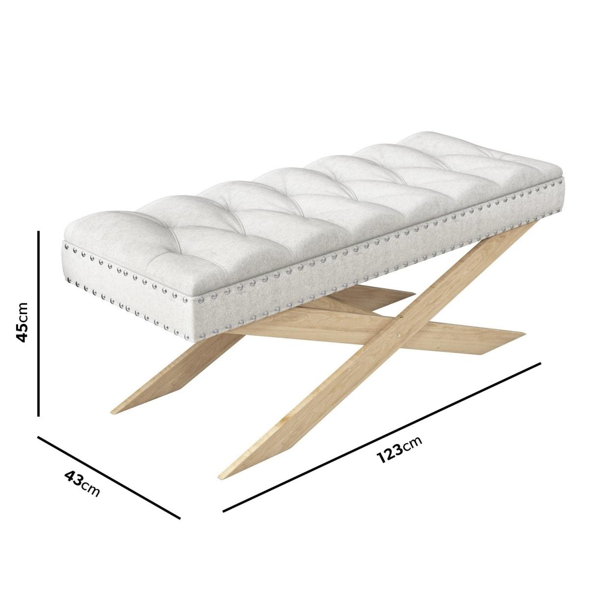 Features we love Wooden end-of-bed bench with buttoned chesterfield seat. Upholstered in a beautiful light grey woven fabric Elegant studded detailing secures the fabric edges. Gorgeous solid wood crossed legs in natural oak colour. Search 'Maeva' to browse the matching bedroom collection All about me. Add a luxurious statement piece to your bedroom with this Maeva upholstered end-of-bench in light grey. Position at the foot of your bed for an immediate focal point or use as a window seat for moments of reflection. A matching ottoman storage bed and alternative colours are also available. Need to know. Overall dimensions. W120 x D43 x H45 cm Colour. Light grey and silver (studs) Finish. Upholstered Material. Multi-layer board solid wood woven fabric and metal (studs) For use. Indoors Product weight. 18.5kg Max weight capacity. 120kg Assembly required. Yes.