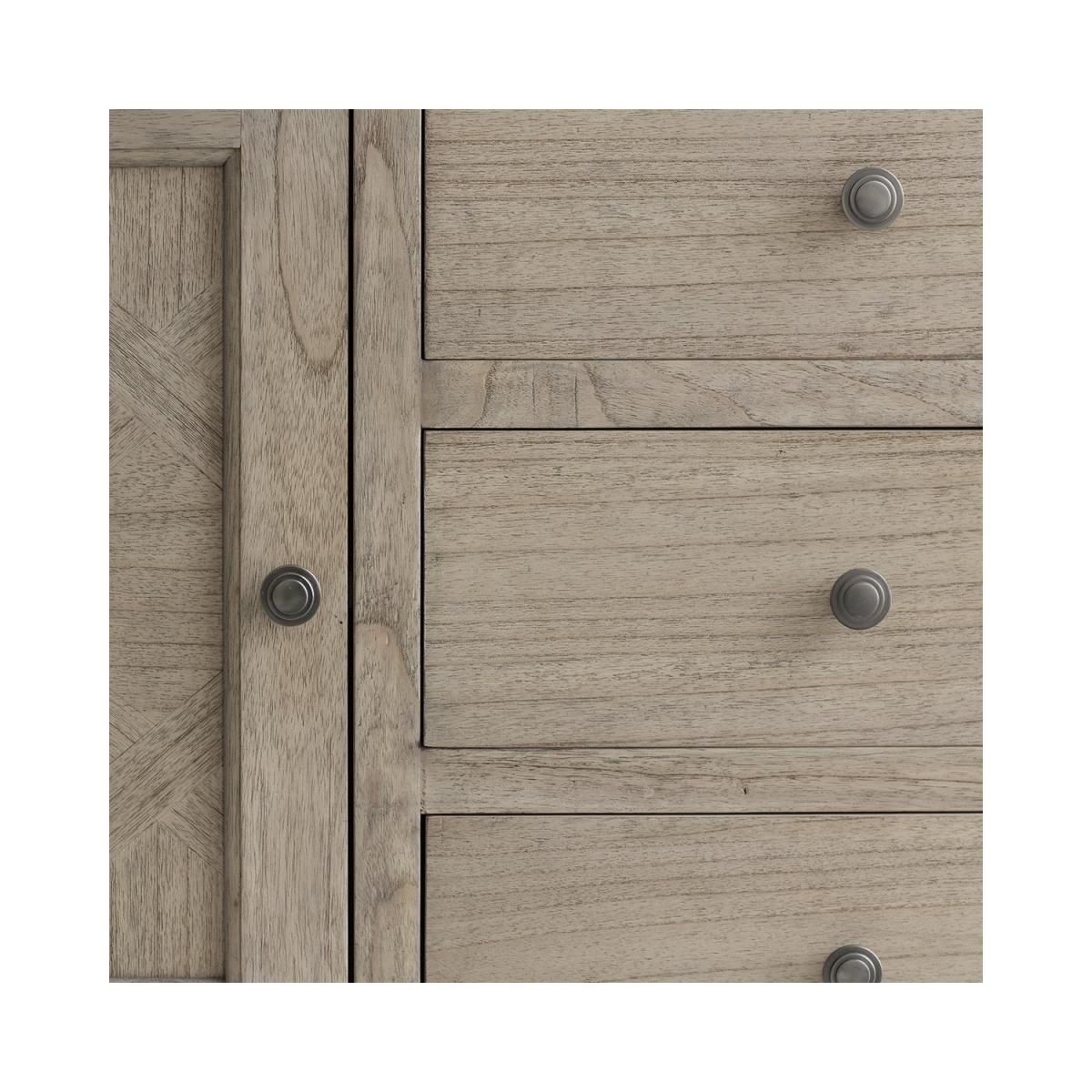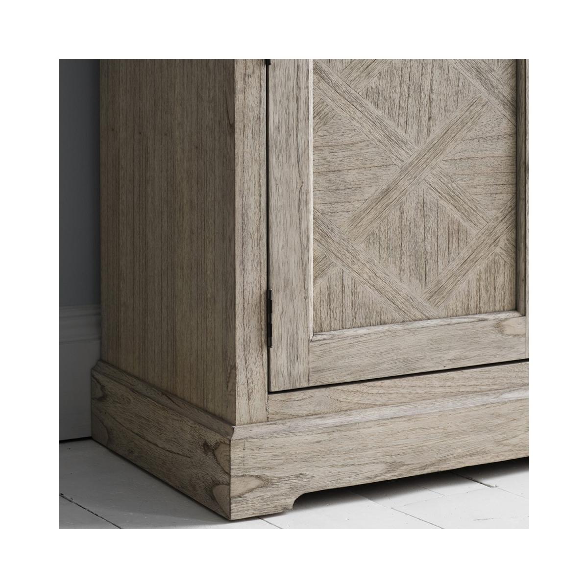 Dimensions:W150 x D45 x H80 cm With a nod towards the French colonial style this practical sideboard is made from Mindy ash and features parquet inlaid veneer work in a lightly brushed natural finish. Each shelf contains an adjustable shelf. Features: Mindy Ash Storage 2 Doors / 3 Drawers Matching items available Some assembly required